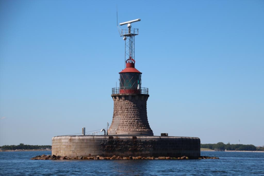 Um 11 Uhr sind wir dann durch die Brücke am Christianshafen ausgelaufen und auf der Strecke, die ich einige Tage zuvor mit Jörg nach Kopenhagen hinein gefahren bin, ging es nun wieder hinaus. Nach einem Tankstopp ging es dann wieder vorbei an der Öresundbrücke, dem großen Windpark aber dann nicht nach Schweden zurück, sondern weiter Richtung Westen. Vorbei an mächtigen Seezeichen, patroullierenden Marinebooten und an den Stevns Klingt, wo eine alte Kirche ganz nahe auf den Kreide-Klippen steht.