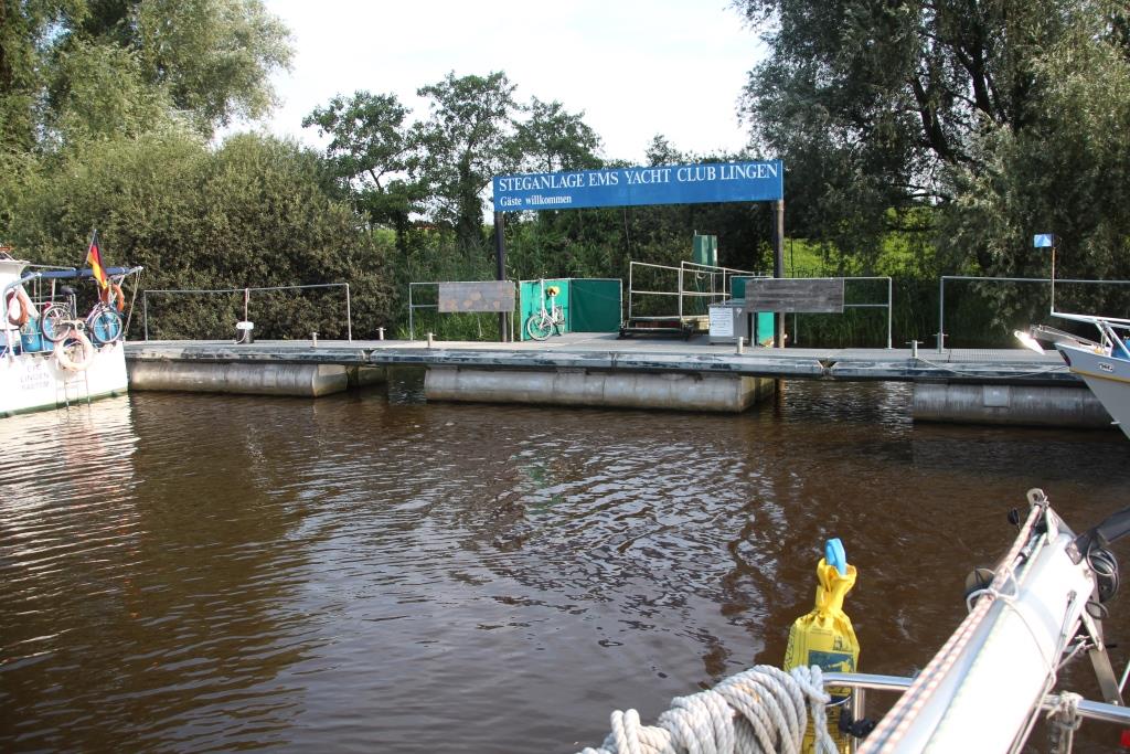 Nach rund 7 Stunden erreichte ich die Schleuse in Dörpen und kurz danach die Einfahrt in die Ems bzw. den Dortmund-Ems-Kanal. Nach einer weiteren Schleuse in Bollingerfähr erreichte ich den Anleger des Ems Yacht Club Lingen in einem alten Emsarm kurz vor der Seeschleuse in Herbrum.