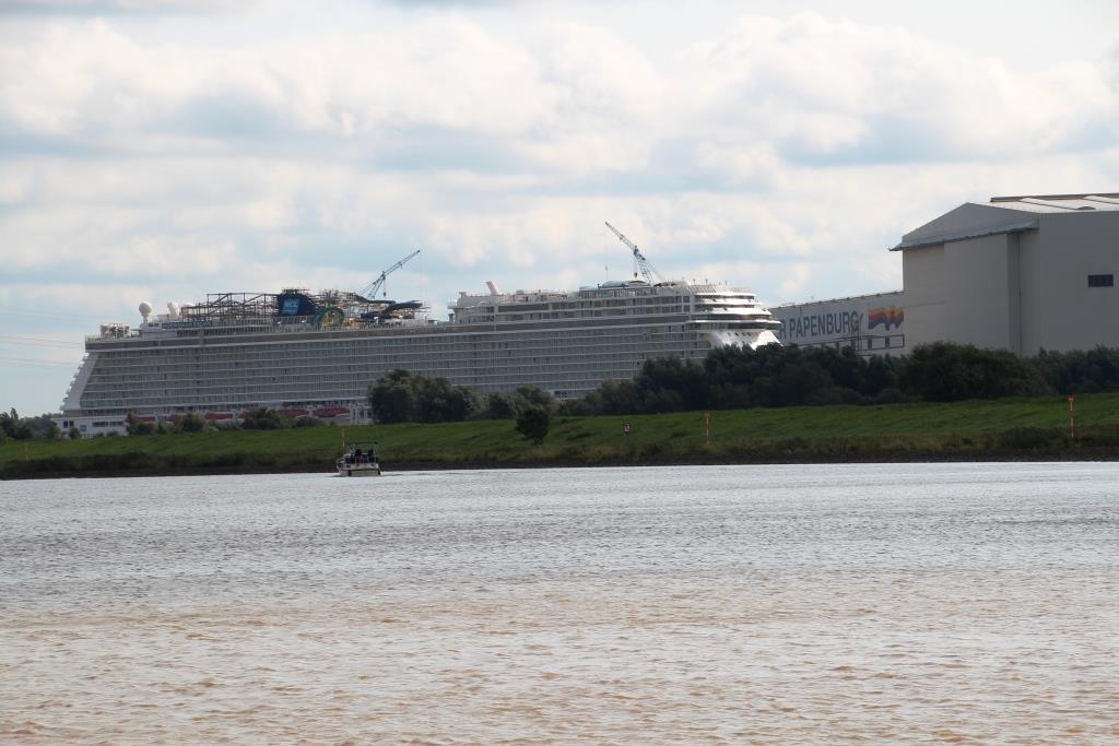 Ob es daran lag, dass der gestrige Emslandtag nicht ganz so erquickend war, auf jeden Fall war ich dann nicht wie geplant nach Steuerbord zur Seeschleuse nach Papenburg eingebogen, sondern habe mich vom kräftigen Emsstrom einfach daran vorbei treiben lassen. Obwohl der große in Bau befindliche Cruiser Norwegian Escape (325 Meter, 4.200 Passagiere) auf der Meyer Werft schon ein wenig gelockt hat… Im September tritt er dann die Reise – wie ich heute – über die Ems Richtung Nordsee an. Allerdings rückwärts. Wie dieses Teil dann durch die Brücken und das Ems-Sperrwerk passen soll? Wird wohl…