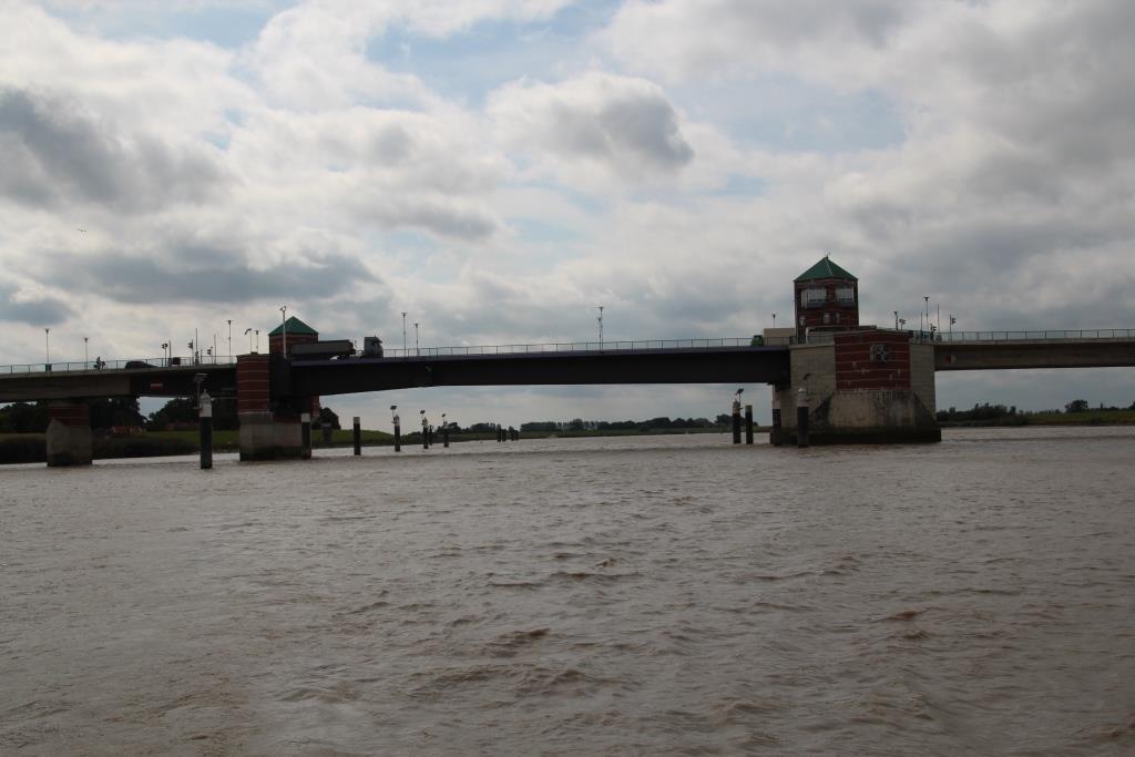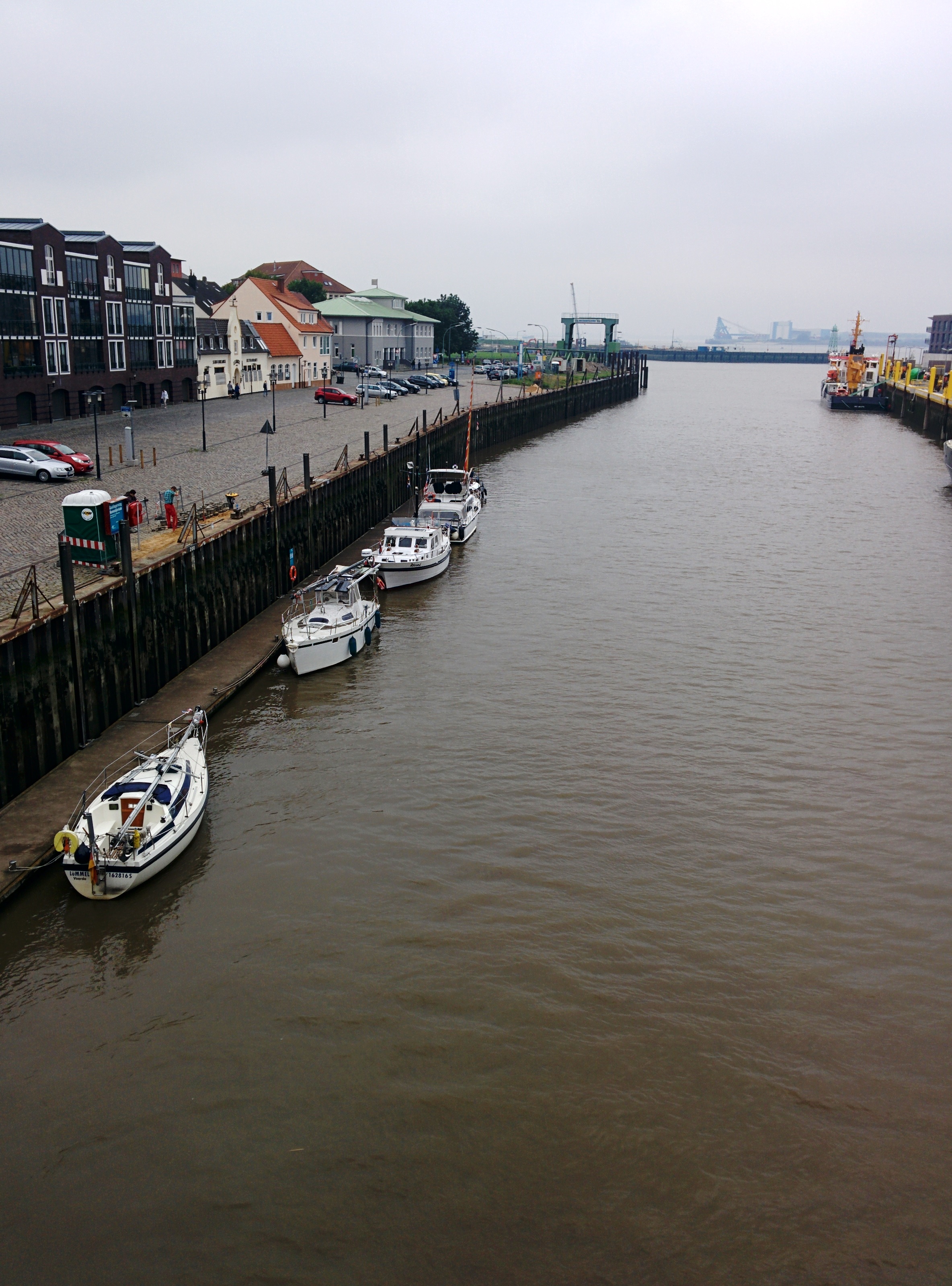 Das Niedrigwasser in Bremerhaven war für 13:57 Uhr angesagt. Darauf wollte ich mit der Weiterfahrt warten, denn es machte überhaupt keinen Sinn, gegen die Weser bei ablaufendem Wasser Richtung Süden zur Hunte anzukämpfen. Also bin ich dann zunächst durch die Seeschleuse der Geeste gefahren und bis kurz vor die Mündung in die Weser die letzten Windungen getuckert. Dort habe ich direkt hinter der Kennedybrücke an einem Schwimmsteg festgemacht.