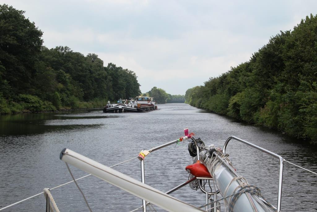 Was dann begann, war schon ein wenig eintönig. Aus einigen Gesprächen mit Revierkennern hatte ich schon davon gehört, dass der Küstenkanal recht „langweilig“ sei. Am Anfang dachte ich noch: geht doch, nette Häuschen links und rechts, aber dann brach die Bebauung ab und es kamen recht lange und schnurgerade Passagen. Abwechslung brachten allein einige Industrieanlagen und Torfverladestationen sowie die Begegnungen mit entgegenkommenden Binnenschiffen. Ich habe sie gezählt, es waren genau 8 bis zur Schleuse in Dörpen! Und exakt 4 Sportboote! Mit irgendetwas musste ich mich ja beschäftigen…