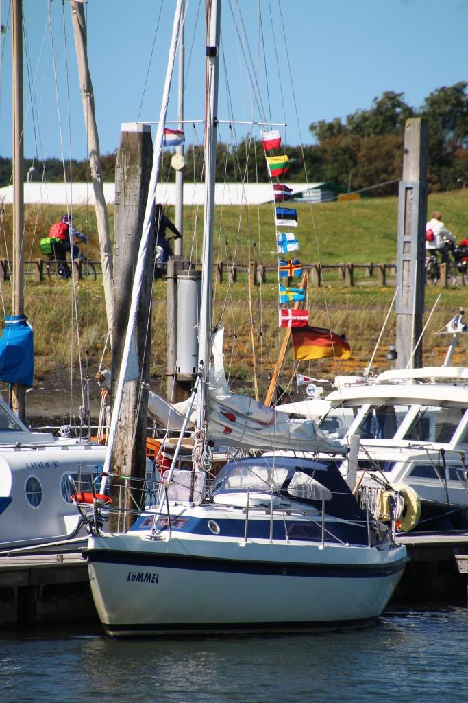 Wie geplant, ging es heute dann von Groningen nach Lauwersoog. An einem Tag, den man – rein wettertechnisch – direkt streichen sollte. Es hat den ganzen Tag geschüttet. Teilweise so heftig, dass ich nicht einmal meine Kamera in die Hand nahm, um ein Foto zu machen. Auf jeden Fall erreichte ich am Nachmittag den Yachthafen Noordergat in Lauwersoog am Lauwersmeer. Schon von unterwegs hatte ich mit dem Hafenmeister telefoniert und einen Termin zum Mast stellen vereinbart. Und schon gegen 19:00 Uhr war LuMMEL wieder ein Segelboot! Und beflaggt mit den Gastlandfahnen der bereisten Länder!
