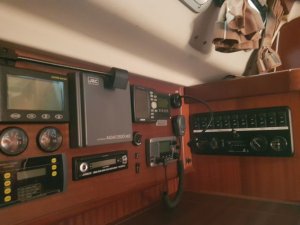 Von einem Schreiner hatte ich mir dann eine neue Platte fertigen lassen und die verbliebenen Geräte neu eingebaut.  Neu hinzu kam noch das AIS (hatte ich von LuMMEL mitgenommen) und eine Halterung für ein Tablet, auf dem ich auch unten am Navigationsplatz mir über WLAN die Anzeige vom Kartenplotter anzeigen lassen kann. Leider habe ich kein Bild von der aktuellen Konfiguration, aber es sieht nun deutlich aufgeräumter aus.
