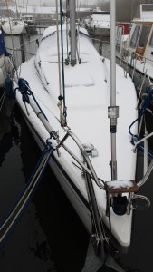 Canata ist dann im letzten Winter im Wasser geblieben. So konnte ich an ein paar Wochenenden im Winter auch ein wenig herumbasteln und auch ein paar Nächte auf dem Schiff verbringen. Trotz Kälte konnte es mir die Dieselheizung immer muckelig warm an Bord machen, auch wenn es draußen mal sehr winterlich war und das Deck einer Skipiste ähnelte.