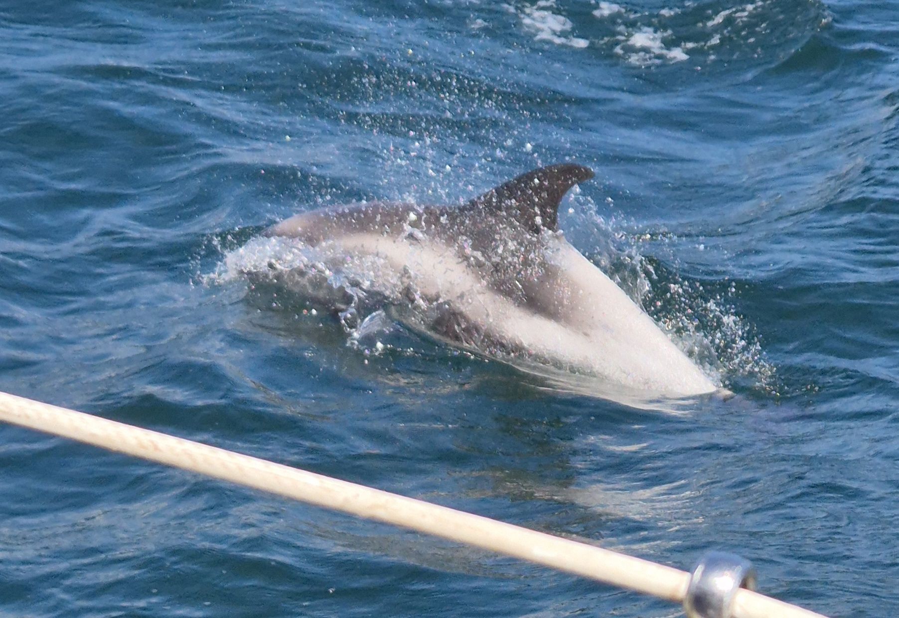 Viel schöner und vor allem weniger peinlich, war die ca. halbstündige Begleitung einer aus fünf bis 6 Tieren bestehenden Schule von (mutmaßlichen) Weißschnauzendelphinen. Hinter dem Boot, vor dem Boot, neben dem Boot und nach einem Sprint wieder vor dem Boot und unter dem Boot tummelten sich die Tümmler sichtlich vergnügt in meinem Fahrwasser. Es ist schon echt schwierig vernünftige Fotos davon zu schießen. Vor allem mit dem Handy, lag meine Kamera noch sicher verstaut unten im Boot. Aber ein paar Schnappschüsse sind mir dann doch gelungen.