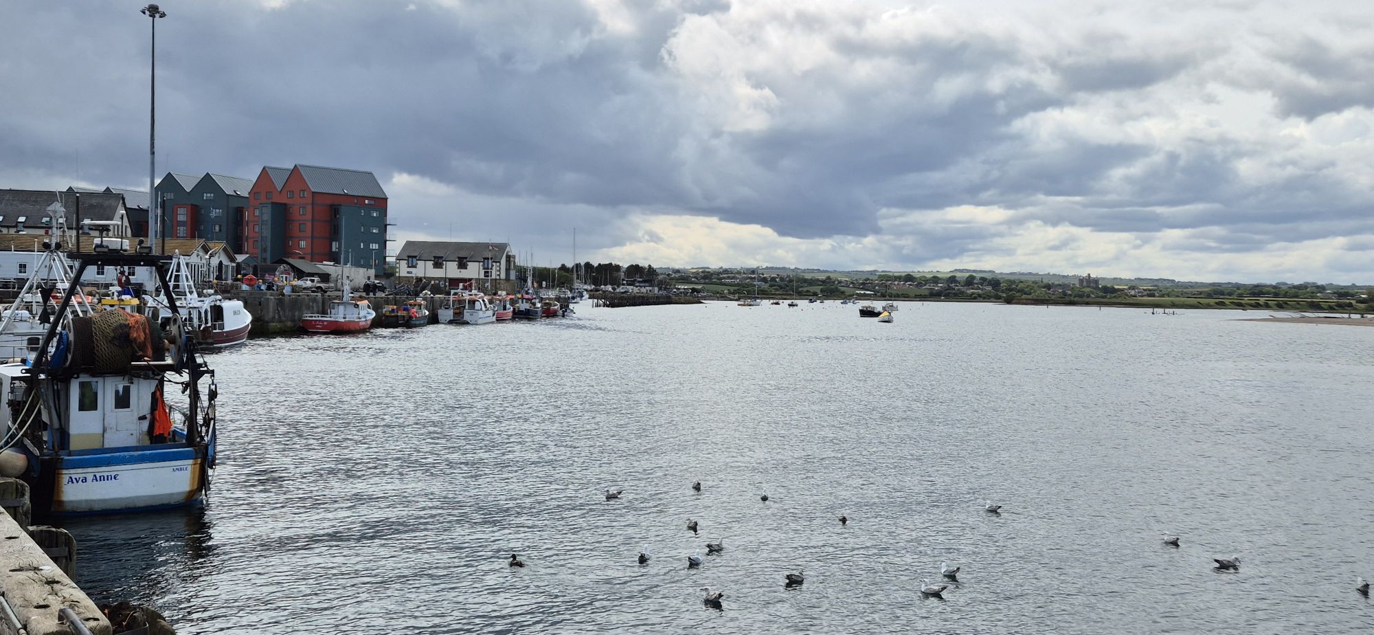 Es war eine unruhige Nacht. Nicht, dass der Anker nicht gehalten hätte, aber es war doch so viel Wind, dass das Schiff immer mal wieder an der Kette zerrte und für Bewegung sorgte. So war ich schon vor dem Wecker wach und konnte dann auch pünktlich um kurz nach 6 Uhr den Anker lichten, Segelsetzen und mich auf den Weg machen. Nur eine kurze Etappe von rund 20 Seemeilen bis Amble, wo ab ca. 11:00 Uhr genug Wasser in Hafen sein sollte, um einlaufen zu können. Ich war dann aber doch so schnell, dass ich noch ein wenig warten musste. Die Zeit habe ich mir dann mit einem ersten Angelversuch verkürzt, bei dem dann auch prompt mein Köder abgerissen ist…