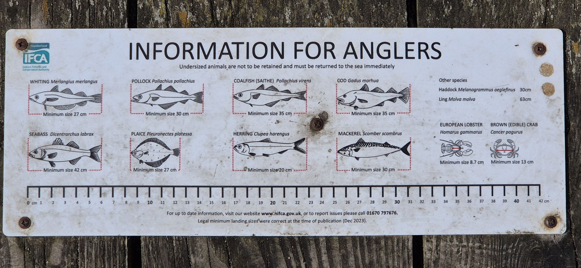 Amble (übersetzt „schlendern“) liegt am kleinen Flüsschen Coquet. So ist auch die dem Ort vorgelagerte Insel mit dem Leuchtturm die Coquet-Island mit dem Coquet-Lighthouse. Ich habe es dann auch wörtlich genommen und bin ein wenig durch den familienfreundlichen Urlaubsort (Wikipedia) geschlendert und habe noch ein paar Besorgungen gemacht. Gut, dass trotz Sonntag hier die Supermärkte geöffnet haben. Auf der Mole der Hafeneinfahrt habe ich dann noch einen besonderen Service für die Angler gefunden. Die Mindestmaß der Objekte der Begierde.