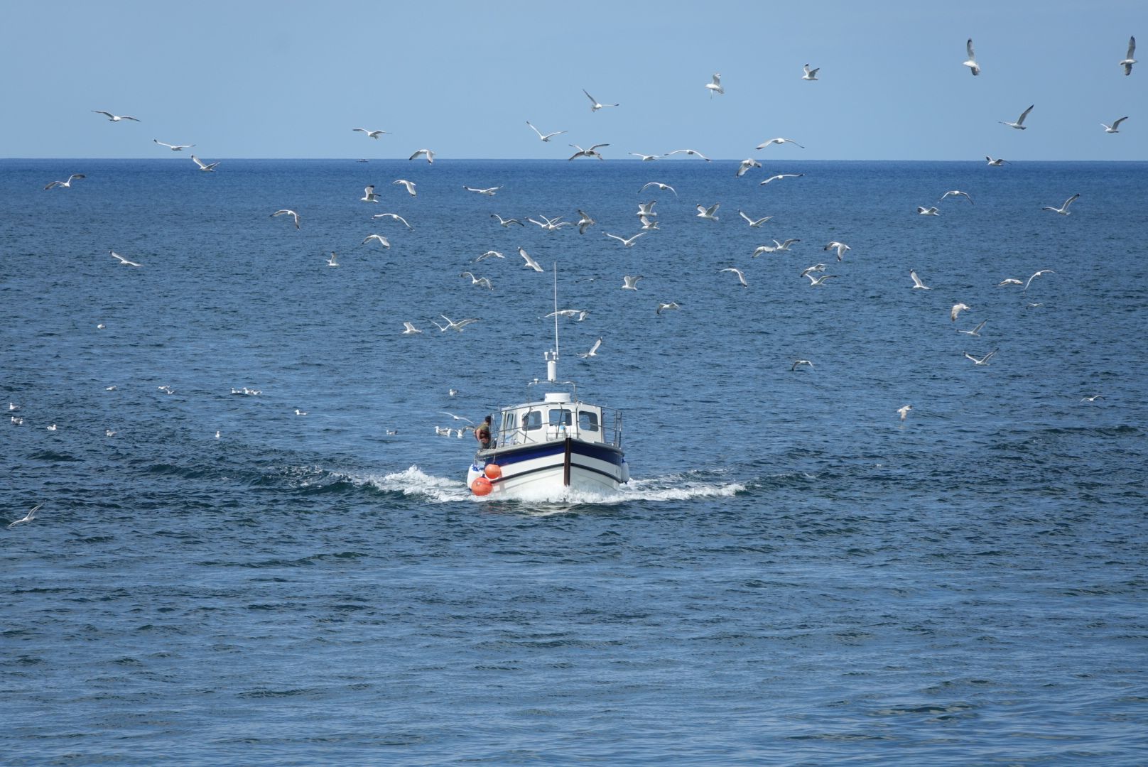 Je weiter ich nach Whitby kam, desto mehr Fischer- und Angelboote bekam ich zu sehen. Hier scheint man noch gute Fangmöglichkeiten als Angler zu haben, anders als bei uns in der Ostsee, wo der Dorsch ja nahezu ausgestorben ist. Auch ein ganzer Schwarm verschiedener Seevögel balgten sich unterwegs um die besten Stücke eines Fisch-Kadavers.