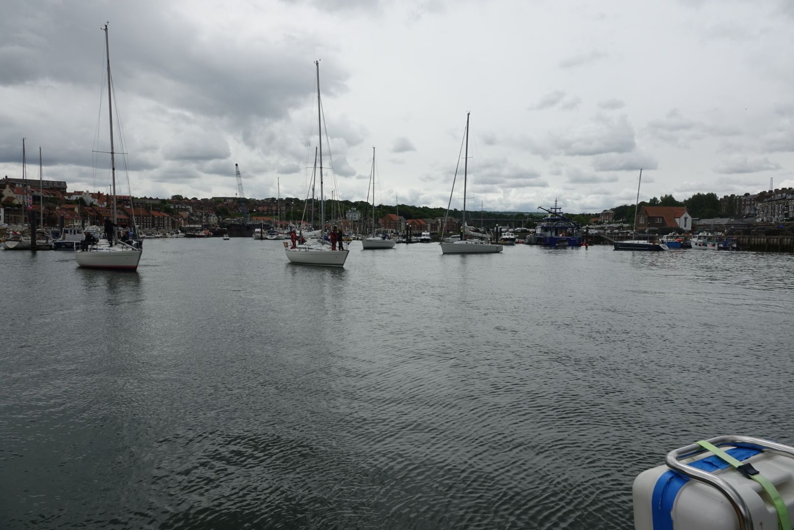 Nach dem Duschen und Frühstücken war es dann auch bald 12:30 Uhr, Zeit für die Öffnung der Swing-Bridge, die die Segler wieder in die Freiheit der Nordsee entlässt. Ich wartete auf die Öffnung der Brücke mit mehreren „locals“, die vor Whitby ihre regelmäßige Clubregatta ausfechten wollten. Ich war mit Canata von den rund 10 Booten dann auch das einzige, das sich auf den Weg Richtung Norden machte. Ziel meiner Segeltour heute war der River Tyne. An diesem Fluss liegt auch die englische Großstadt Newcastle. Sicher allein schon einen Besuch wert. Allerdings wollte ich dort nicht hin. Ich hatte mir vorgenommen, im Schutz der dortigen Molen an der Mündung die Nacht vor Anker zu verbringen, da ich ohnehin am nächsten Morgen wieder zeitig um 6:00 Uhr weiter wollte. Da kann man sich das Hafengeld (für mein Boot durchweg über 40€/ Nacht!! Ohne Strom, dafür 5,50 € extra) mal sparen, zumal wenn man frisch geduscht und geföhnt am Morgen losgefahren ist.