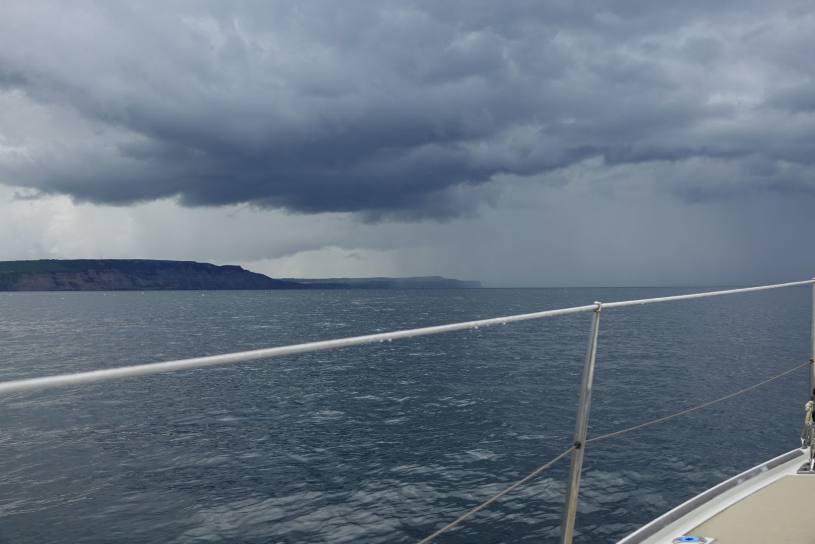 Also musste ich die Abfahrtszeit in Scarborough so kalkulieren, dass ich gegen 13:00 Uhr in Whitby bin. Ca. 20 Seemeilen, recht wenig Wind, ca. 1 kn Gegenströmung, also ca. 5 Stunden Fahrzeit. Abfahrt also 8:00 Uhr. Eine moderate Zeit in einem Gezeitenrevier 😊. Aus Scarborough kann man bei jeder Tide auslaufen. Jedenfalls mit Canata und ihren 1,50 Metern Tiefgang. Kurzer Plausch per Funk mit der Portcontrol über meine Absicht den Hafen zu verlassen und schon war ich wieder unterwegs. Segel setzen, Motor aus und die Ruhe genießen. Ein Blick zurück nach Scarborough, einem Ort, von dem ich mir ein wenig mehr versprochen hatte.