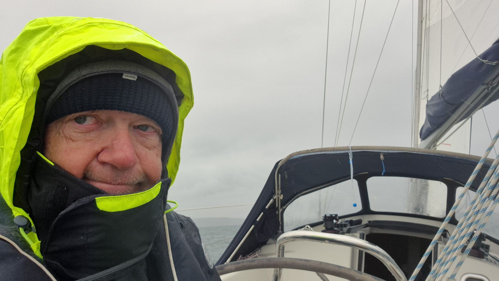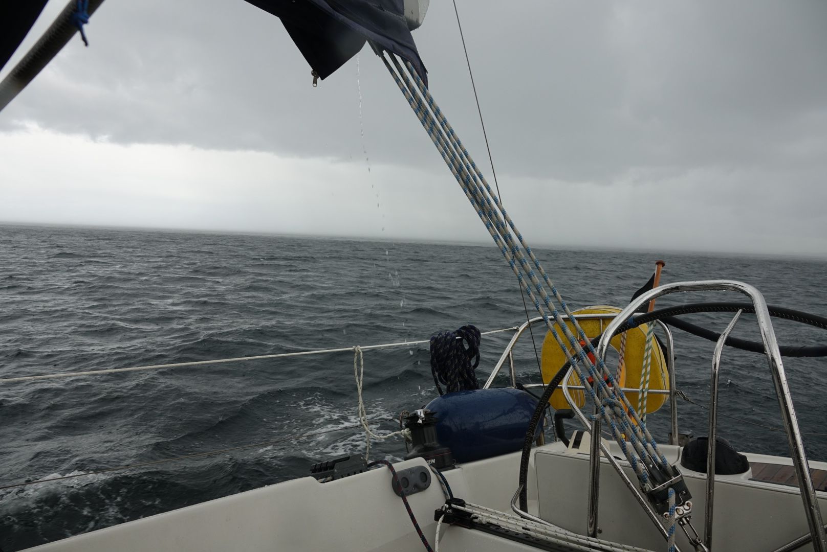 Am Anfang wehte noch ein recht frischer Wind mit 4 Bft., der mich zügig Richtung Norden wehte. Allerding auch mit viel Regen im Gepäck, so dass Regenhose, -jacke und Gummistiefel angebracht waren. Nach ca. 2/3 der Strecke hörte der Regen dann auf, allerdings stellte dann auch der Wind seinen Dienst ein, so dass ich die letzten Meilen unter Motor zurücklegte.