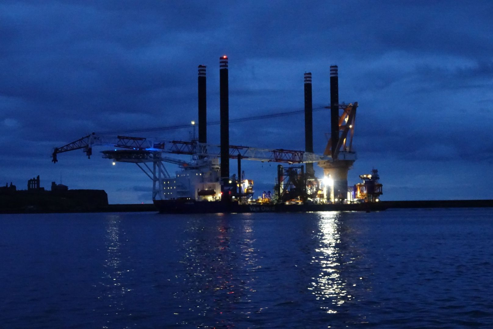 Das zweite interessante Schiff konnte ich von meinem Ankerplatz bei der Einfahrt in den River Tyne beobachten. Die „Aeolus“. Ein sogenanntes „Errichterschiff“ für den Bau von Offshore-Windanlagen. In Deutschland gebaut ist es für ein niederländisches Unternehmen in Betrieb. Mit den 4 langen Hubbeinen kann sich das Schiff in bis zu 45 Meter tiefem Wasser auf Grund festmachen, um die Arbeiten wie eine auf einer kleinen, mobilen Insel verrichten zu können. Wahnsinn…