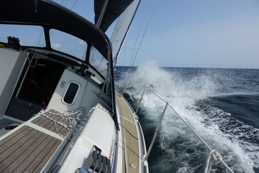 Am Anfang wehte noch ein recht frischer Wind mit 4 Bft., der mich zügig Richtung Norden wehte. Allerding auch mit viel Regen im Gepäck, so dass Regenhose, -jacke und Gummistiefel angebracht waren. Nach ca. 2/3 der Strecke hörte der Regen dann auf, allerdings stellte dann auch der Wind seinen Dienst ein, so dass ich die letzten Meilen unter Motor zurücklegte.