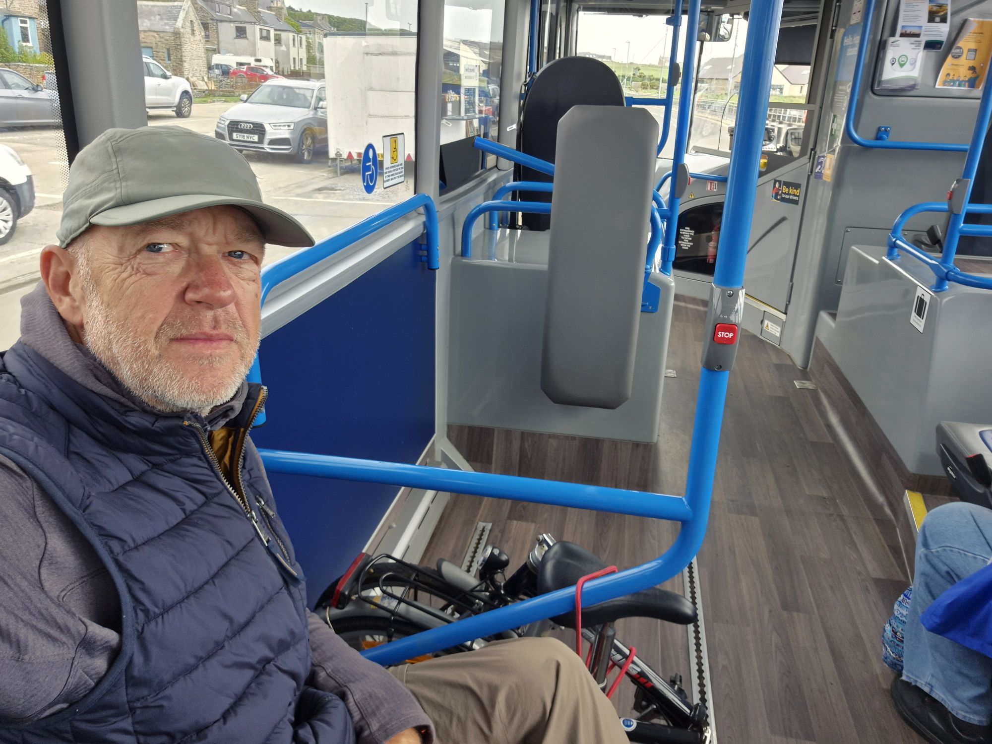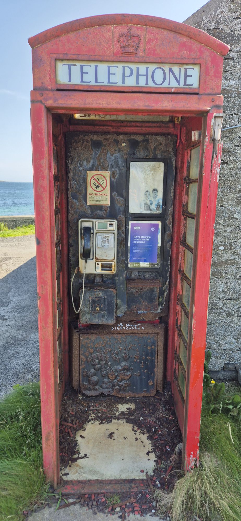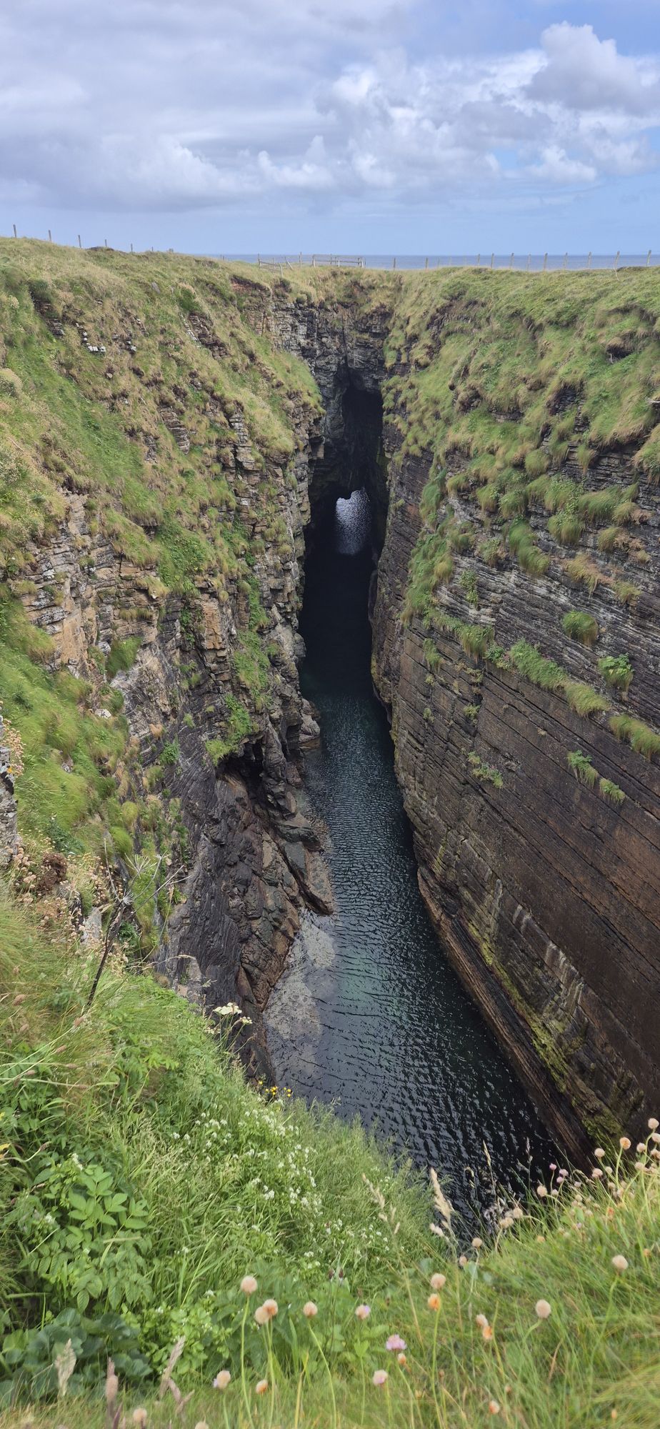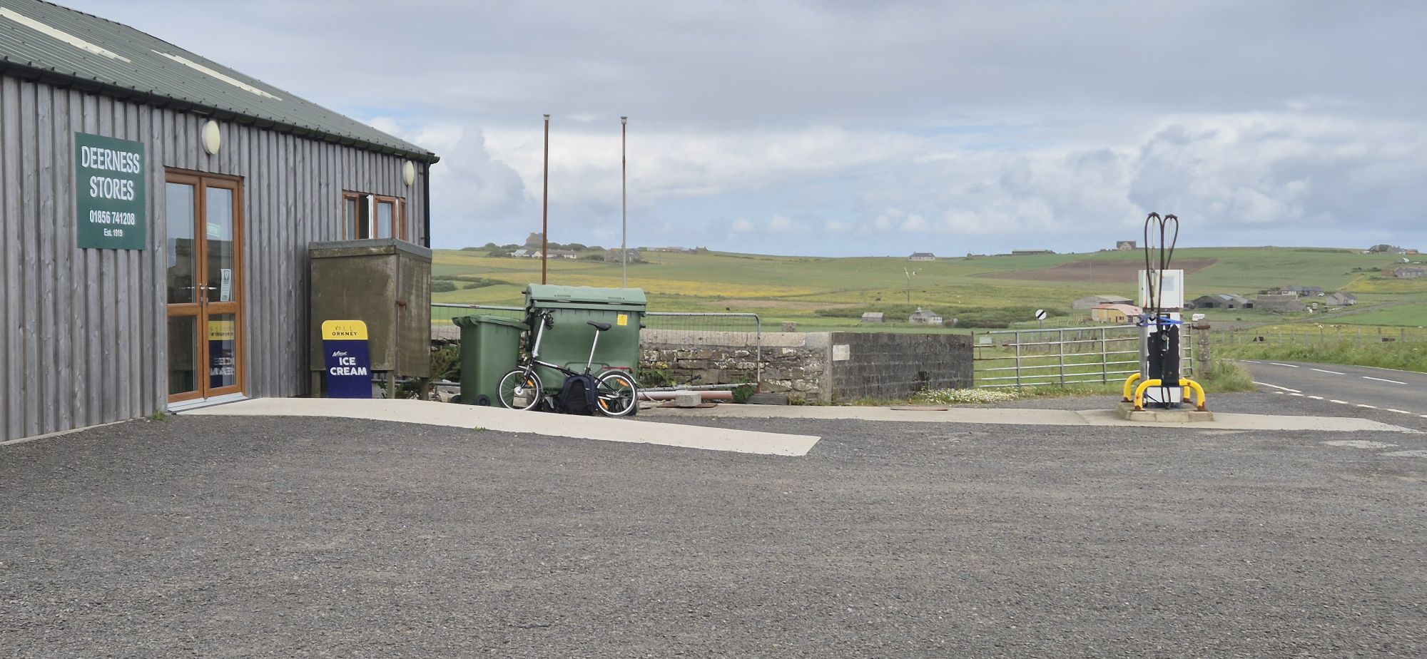 Den nächsten Programmpunkt hätte ich mir schenken sollen. Das Verhältnis zwischen Aufwand und Sightseeing-Freude war einfach nicht ausgewogen. Zumal ich zurück von The Gloupe auf der Halbinsel Deerness (im Prinzip ein schmaler Krater, der aus einer eingestürzten Meereshöhle entstanden ist) auch heftig gegen den Wind anradeln musste, um zur Bushaltestelle zu kommen. Bergab hatte ich teilweise das Gefühl stehen zu bleiben, wenn ich nicht weiter in die Pedale getreten hätte. Da kam mir die ehemalige Tankstelle mit Minimarket sehr gelegen um mich mit einem Kaffee zu stärken und auf den Bus zu warten. Als der kam gab es dann erstmal eine Schrecksekunde. Der Fahrer meinte, dass er Folding-Bikes nun mitnehmen darf, wenn diese in einer Tasche sind. Im ersten Moment dachte ich, dass er mich nun stehen lässt, aber er hatte ein Einsehen und nahm mich doch mit. Der nächste und für den Tag letzte Bus wäre auch schon in 2 Stunden gekommen…
