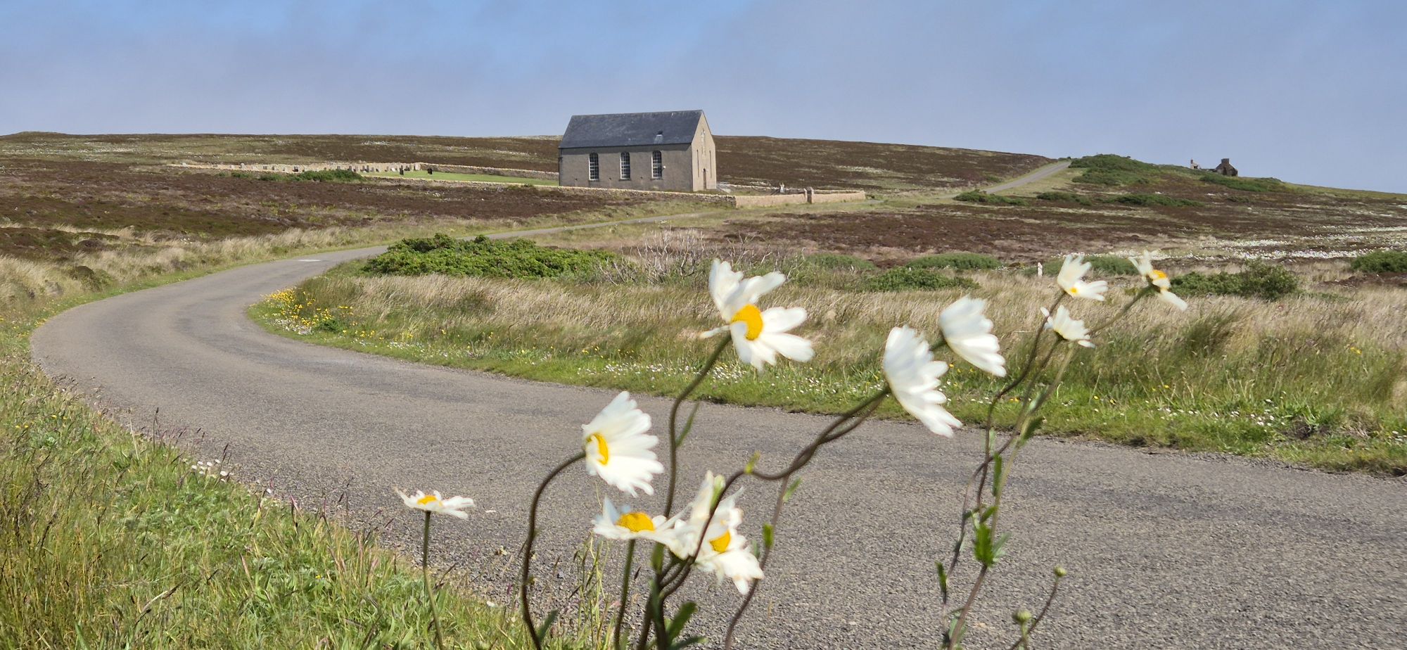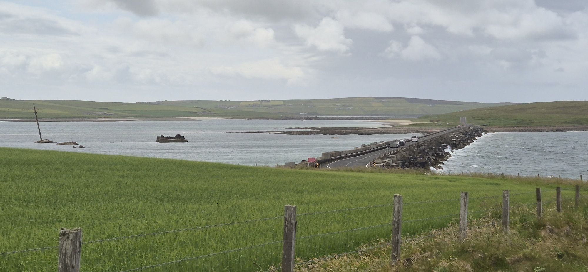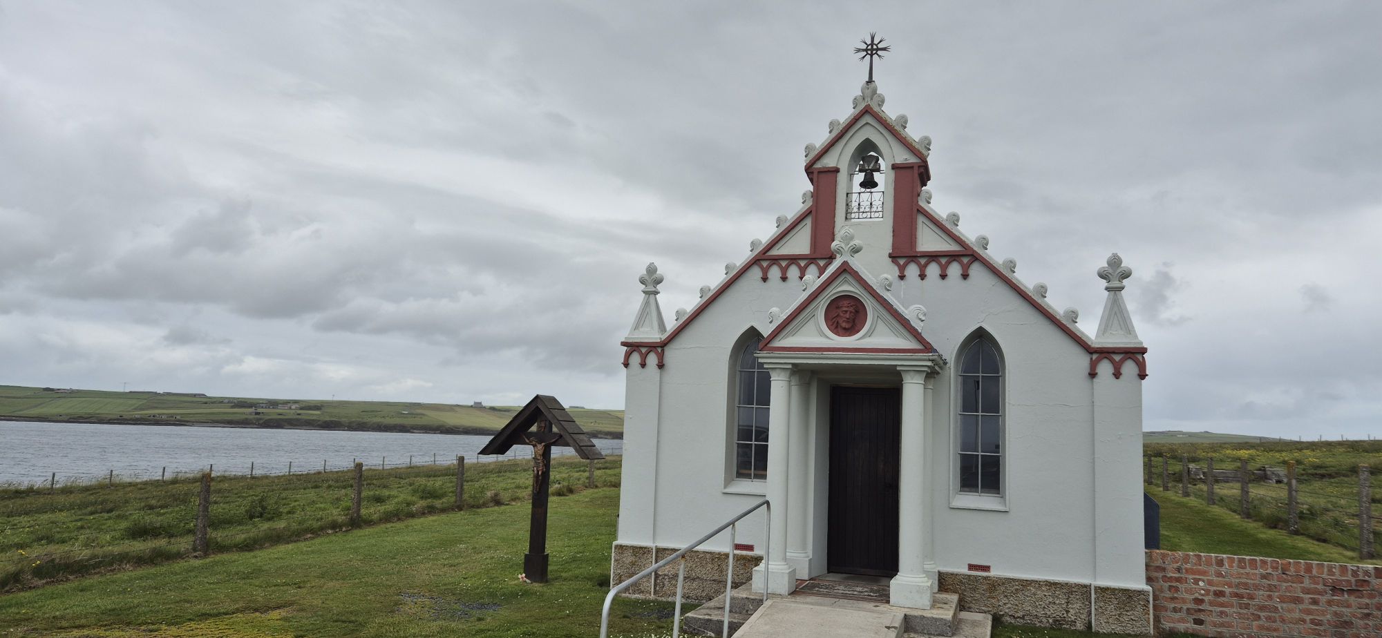 Am nächsten Morgen nach dem Aufstehen wie immer: Wettercheck. Wind bis zu 5 Bft. und auch mal 6. Wanderung auf Hoy… über baum- und strauchloses Land… Wind von vorne… wolkenverhangen… nein, das tue ich mir nicht an. Ticket storniert und Plan B ausgeguckt. Ziel: mit dem Bus bis zur Italien Chapel und den Churchill-Barriers. Von dort per Rad, mit dem Wind weitestgehend im Rücken, über die St. Nicholas Church nach Deerness zu The Gloup und von dort mit dem Bus zurück nach Stromness. Wenn noch Zeit ist, vielleicht noch ein Zwischenstopp in Kirkwall. Da musste ich sowieso umsteigen.
