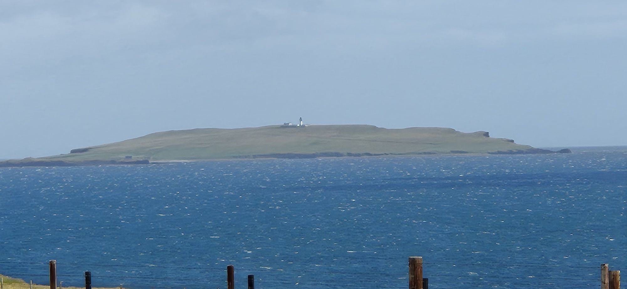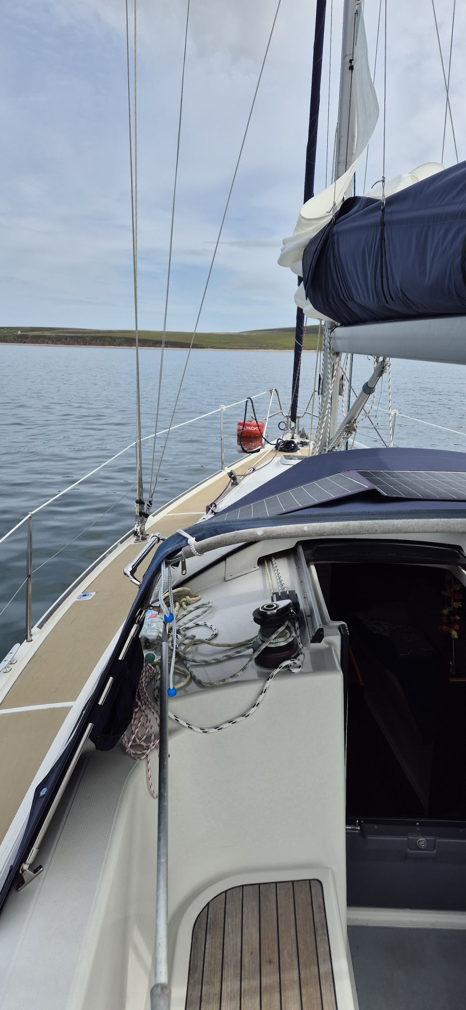 Pünktlich zum Kippen der Tide konnte ich dann Brough Head, die Nordwestspitze von Mainland runden und mein Ziel – die Bucht Fersness – anpeilen. Der Wind ließ zwar stark nach, aber den Motor brauchte ich bis kurz vor Erreichen der Bucht nicht, da mich der noch schwache, achterliche Wind gemeinsam mit der Strömung immerhin mit bis zu 5 Knoten zu meinem Ziel schob. Zu meiner Freude war die Visitor-Mooring in der Bucht noch frei, so dass ich keinen Anker ausbringen musste. Das hat den Vorteil, dass man bei Kentern der Tide (da dreht sich das Boot einmal um 180°) nicht um den Halt des Ankers fürchten muss und so eine vermutlich ruhigere Nacht hat. 7,5 Stunden brauchte ich für die ca. 35 Seemeilen lange und gemütliche Reise.