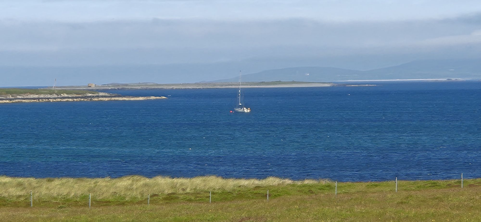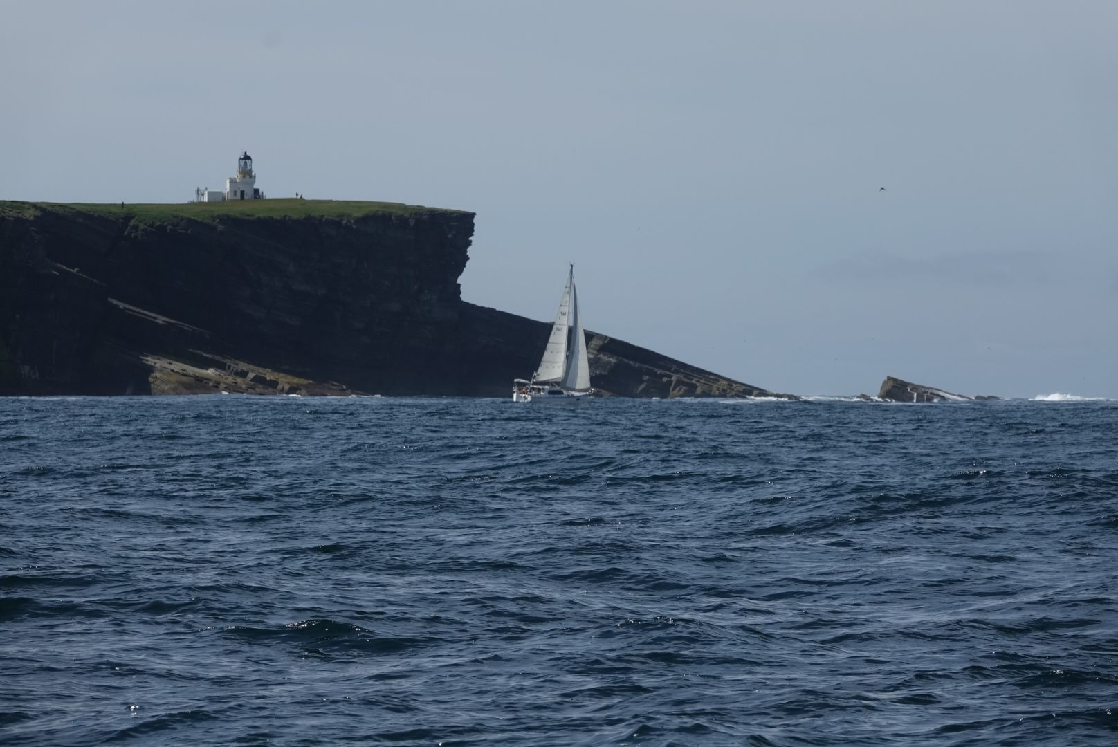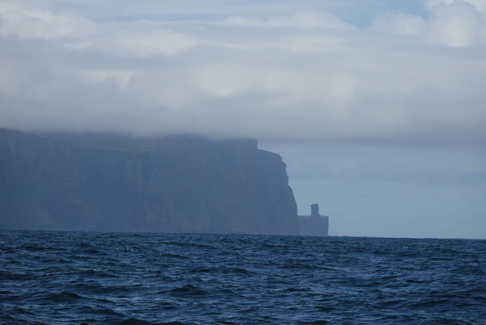 Zwei weitere Ziele wollte ich auf den Orkneys noch ansteuern. Zum einen wollte ich mal ankern bevor ich dann auf die Insel Westray in die Marina nach Pierowall gehe. Dazu hatte ich mir eine Bucht bei der Insel Eday ausgeguckt. Fersness Bay. Eine sehr große Bucht, die bei den angesagten Winden gut geschützt und durch das Gewimmel der Gezeiten auch gut von Stromness aus zu erreichen ist. Nicht zu komplizierte Strömungsverhältnisse, die ich auch gut ohne Beratung von einem Local-Yachtsmen hinbekommen kann. Die war in Stromness nicht zu bekommen, die Hafenmeister nur Aushilfen zum Kassieren, aber keine wirklich Revierkundigen. Also ging ich mit dem letzten ablaufenden Wasser zwischen den Inseln Mainland und Hoy hinaus auf den Atlantik. Richtig. Nix Nordsee. Die westliche Seite der Orkneys ist dann schon streng genommen der Nord-Atlantik. Trotz moderatem Wind stand bei der Strömung in der Enge zwischen den Inseln eine prima Welle. Ich möchte mir das nicht bei viel Wind vorstellen. Aber nach einer halben Stunde war das Geschaukel vorbei, ich konnte Segel setzen und bei einer leichten Briese gen Norden segeln. Und zu meiner Überraschung sah ich in Richtung Süden dann auch noch den Old Man of Hoy, den ich mir eigentlich aus der Nähe anschauen wollte. Nun sah ich ihn wenigsten in weiter südlicher Ferne und habe ihn mit dem Tele meines Fotoapparates verewigt.