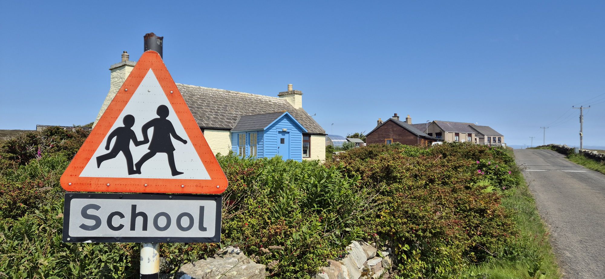 Der Fähranleger war nicht viel mehr als ein Fähranleger und ein paar Parkplätze und sogar eine E-Lade-Station. Kein Geschäft, kein Café, nichts, nada. Also wieder zurück der Straße entlang, vorbei an netten Cottages, der Schule, der Kirche und vielen Feldern und Schafen.