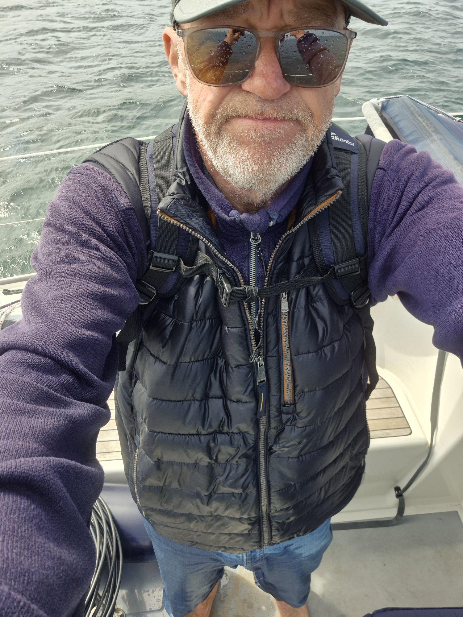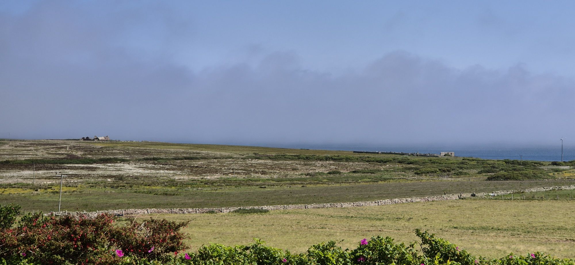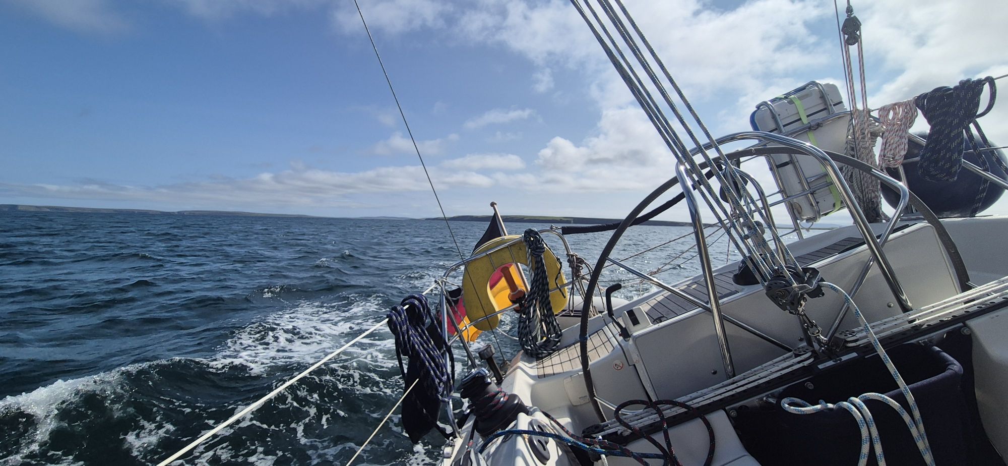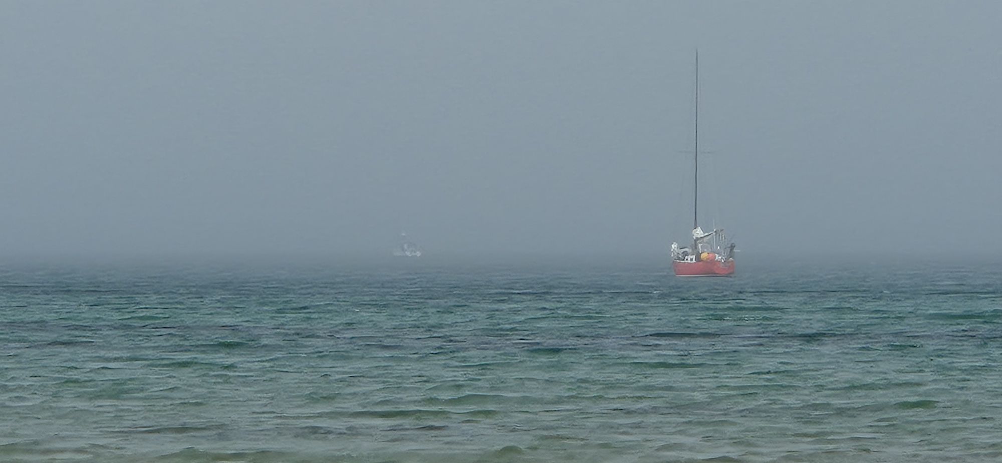 Und bald war es dann vorbei mit der Sonne. Plötzlich zog Nebel auf und ich befürchtete schon, dass ich Canata in der Bucht nicht wiederfinden würde. Aber als ich dort ankam, war der Neben soweit wieder verzogen, dass ich hinsichtlich der Sicht kein Problem hatte. Vielmehr hat mir der Gegenwind auf meiner Fahrt zu schaffen gemacht. Also nicht direkt der Wind, sondern die damit einhergehende Welle, die das kleine Schlauchboot nicht so recht abwehren kann. Patschnass und kalt bin ich nach der 10minütigen Fahrt aber sicher am Ankerplatz angekommen. Nach einer wärmenden Mahlzeit (Rest vom Krebs-Tomaten-Nudelgericht) und einer heißen Tasse Kaffee bin ich dann Richtung Pierowall auf der Insel Westray in See gestochen. Eine kurze Sache. Knappe 15 Seemeilen auf der Kreuz in rund 3 Stunden.