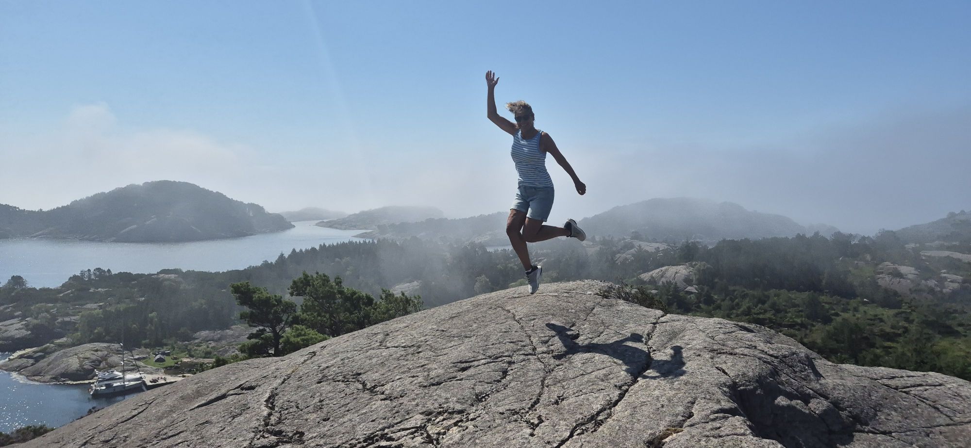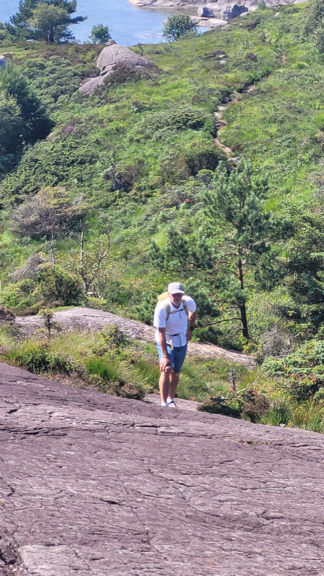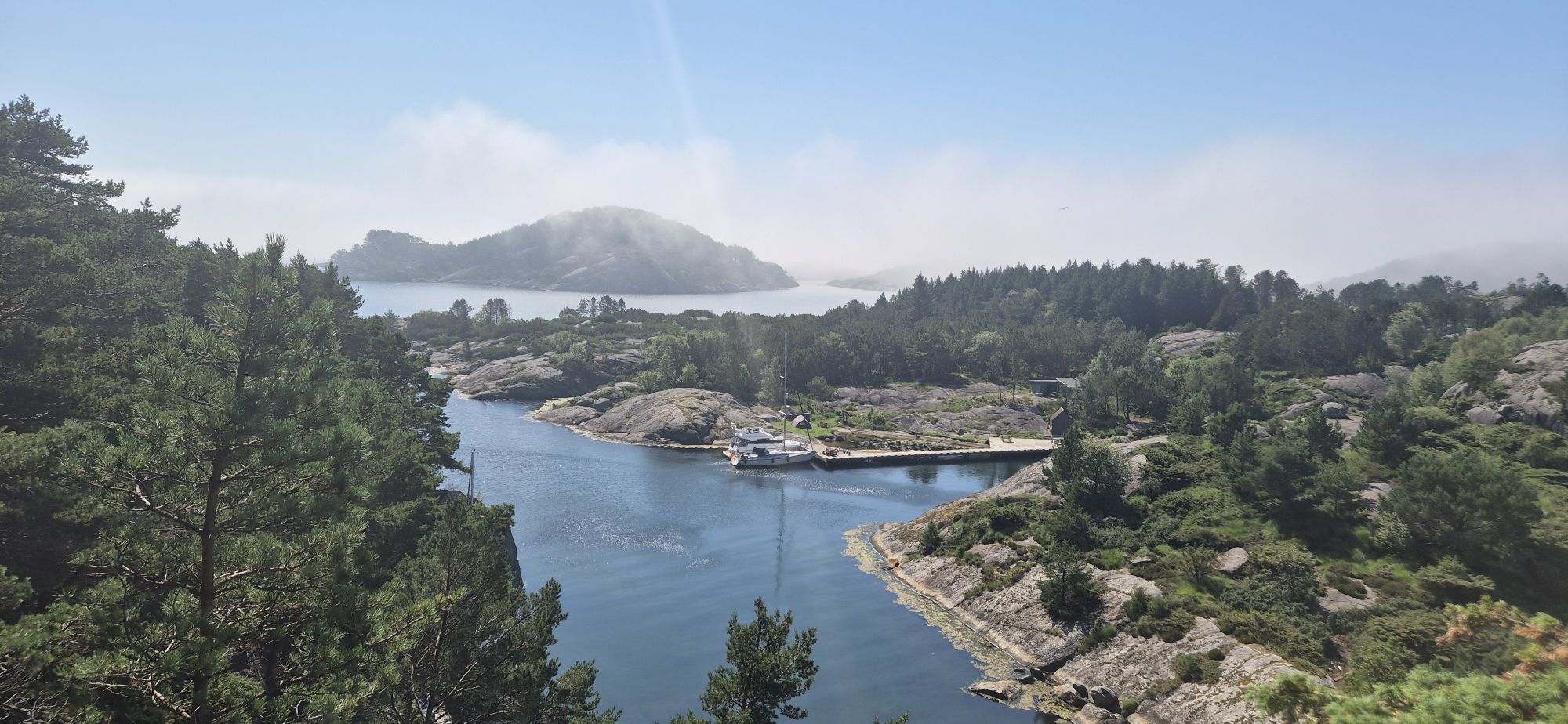 Für den nächsten Tag war brauchbarer Wind angesagt, so dass wir die ca. 40 Seemeilen von Tananger entlang des Jærens Rev nicht nur auf den Motor angewiesen waren. Jærens Rev ist eine mit Steinen durchzogene Sandbank zwischen Tananger und Egersund, die geringe Tiefen aufweist und bei starken Winden zu ungemütlichem Seegang führen kann. Bei Sturm sollte man das Gebiet meiden, will man nicht zu einem der vielen Wracks werden, die an diesem Küstenabschnitt aus früheren Zeiten zu beklagen sind. Aber wir hatte nur leichte, nordwestliche Winde, so dass wir streckenweise sogar mit Gennaker unterwegs waren. Trotz des wenigen Windes hatten wir einen unangenehmen achterlichen Schwell, der Annette die Fahrt nicht zum Vergnügen hatte werden lassen. Aber als wir zwischen den großen und kleinen Felsen bei herrlichem Sonnenschein auf unsere kleine Bucht Gyashavn zusteuerten, war die Seekrankheit schon fast vergessen, so idyllisch war der Anleger in dem Naturhafen umgeben von teilweise bewaldeten Felsen, den wir uns ausgesucht hatten. Ein Platz am Holzsteg war noch frei und wir konnten mit Heckanker anlegen. Da für den nächsten Tag tolles Wetter vorausgesagt war, wollten wir hier den folgenden Tag verbringen, ein wenig baden und eine kleine Wanderung in der Umgebung machen.