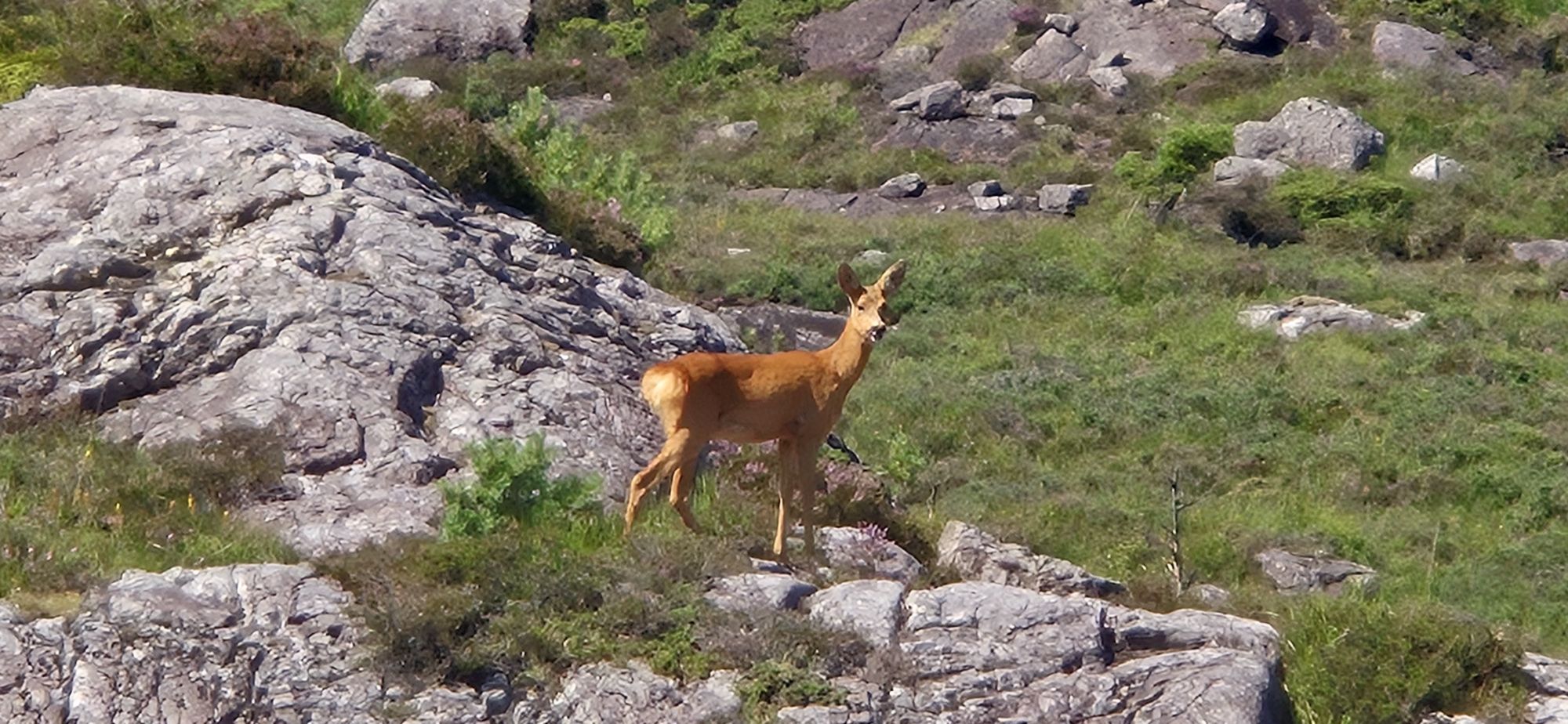 Und so machten wir uns nach dem Frühstück und einem morgendlichen Bad zu einer kleinen Wanderung auf den Weg. Zu einem nicht weit entfernten Strand wollten wir. Abweichend von der Beschreibung im Hafenführer, der die Wege als einfach beschrieb, ging es über Stock, Stein, Wurzeln und Felsen mit teilweise auch kleinen Klettereinlagen durchs Gelände. Unterwegs wünschte ich mit vor allem meine Wanderschuhe, sind wir doch nur mit einfachen Sneakers losgelaufen. Auch ließ mich nach wie vor die Prellung in meinem Knie nicht wie ein Reh (welchem wir unterwegs sogar begegneten) von Stein zu Stein hüpfen, sondern fast jeder Schritt bei Aufstiegen und Abstiegen musste gut bedacht werden. Aber es war eine herrliche Wanderung, ein schöner steiniger Strand und tolle Blicke auf „unseren“ Hafen für zwei Nächte.