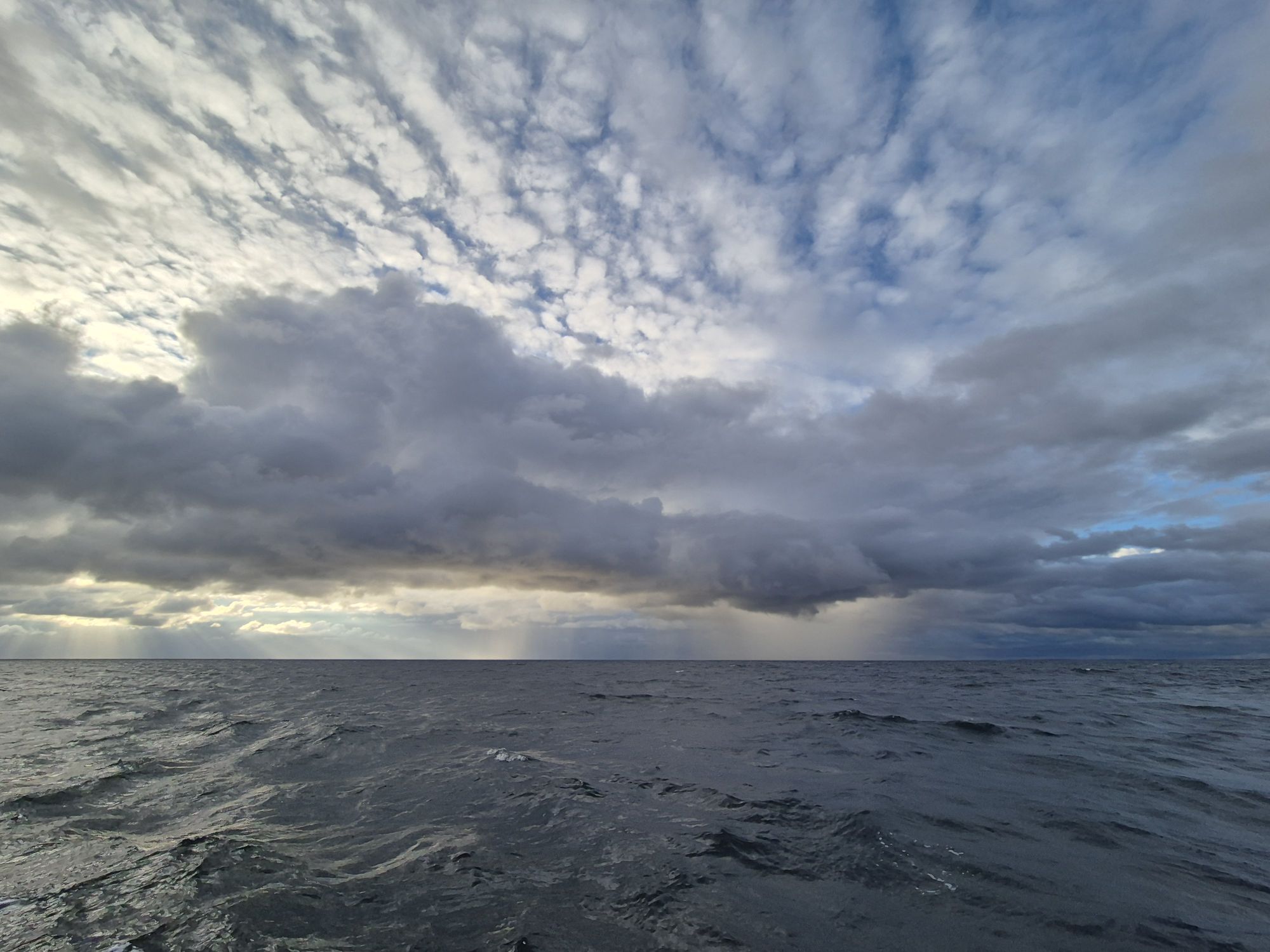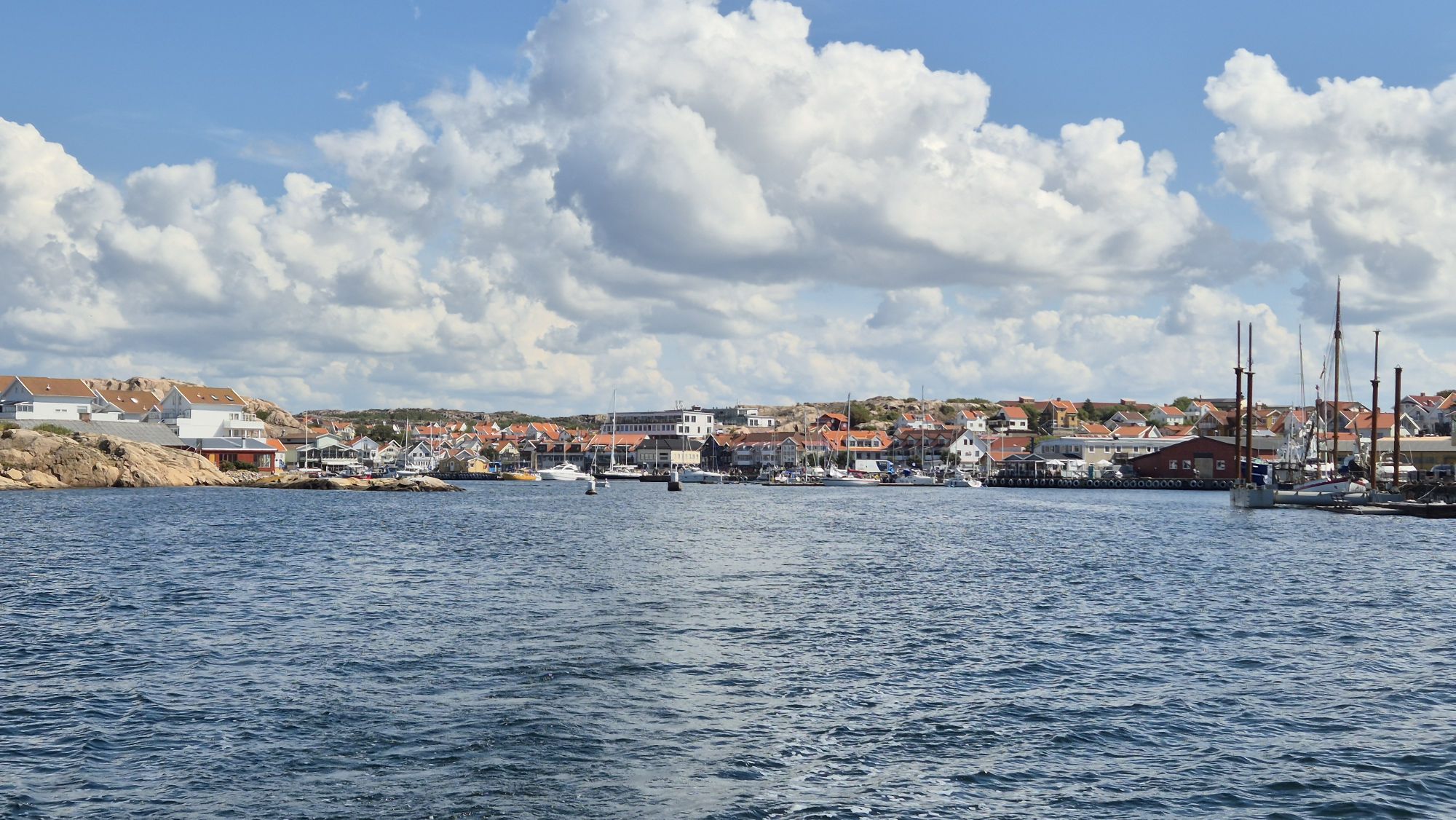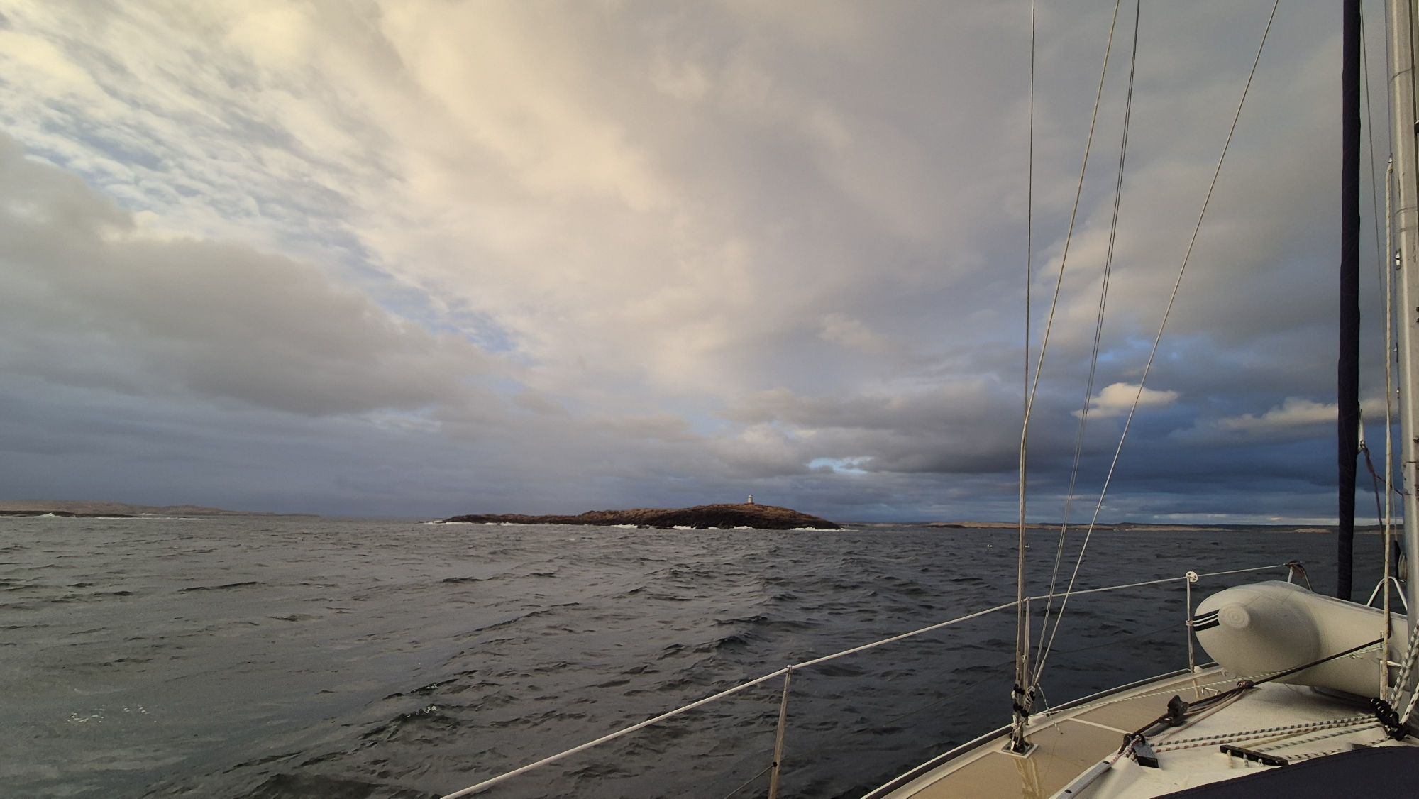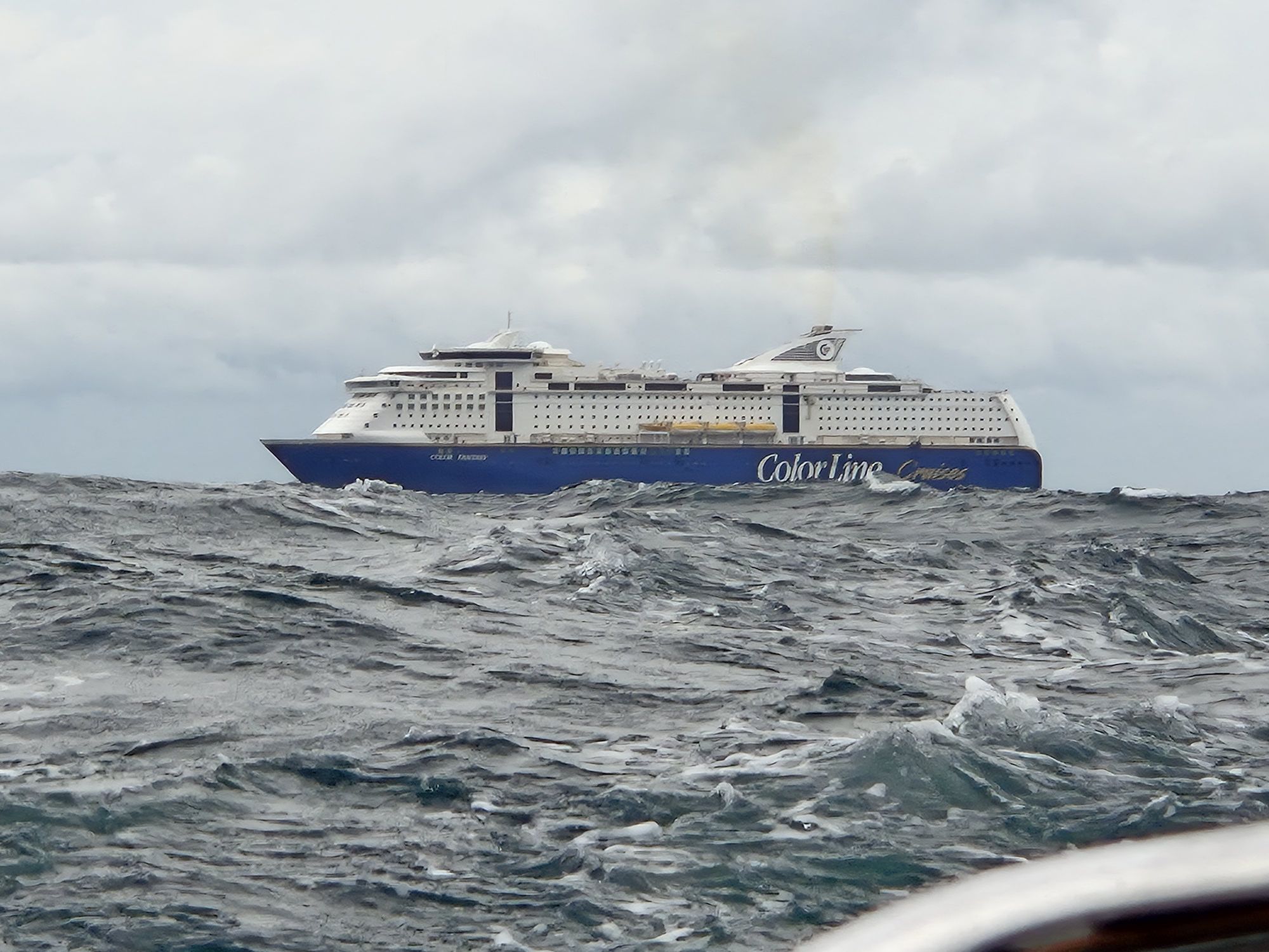 Also gingen kurz nach der Ausfahrt aus den Schären von Risør die Segel hoch. Nach drei Stunden schlief der Wind dann doch ein und wir mussten nun leider den Motor zur Hilfe nehmen. Nach ca. zweieinhalb Stunden kam er aber aus einer leicht veränderten Richtung und etwas stärker wieder. Auch zogen ein paar Regenwolken auf, die ein paar Böen mitbrachten, so dass wir dann sogar das Großsegel verkleinern mussten. Unterwegs begegneten wir der Fähre von Oslo nach Kiel recht nahe. Auch die Wellen nahmen allmählig zu und als dann die schwedischen Schären in Sicht kamen boten diese uns ein schönes Farbenschauspiel zusammen mit den bedrohlich wirkenden Wolkenformationen. Konstantin meinte, ob wir gleich auf dem Mond landen, so unwirtlich sahen die baumlosen und schroffen Schären aus. Ein krasser Gegensatz zu der norwegischen Landschaft mit bewaldeten Felsen und Hügeln, verziert mit bunten Sommerhäuschen.