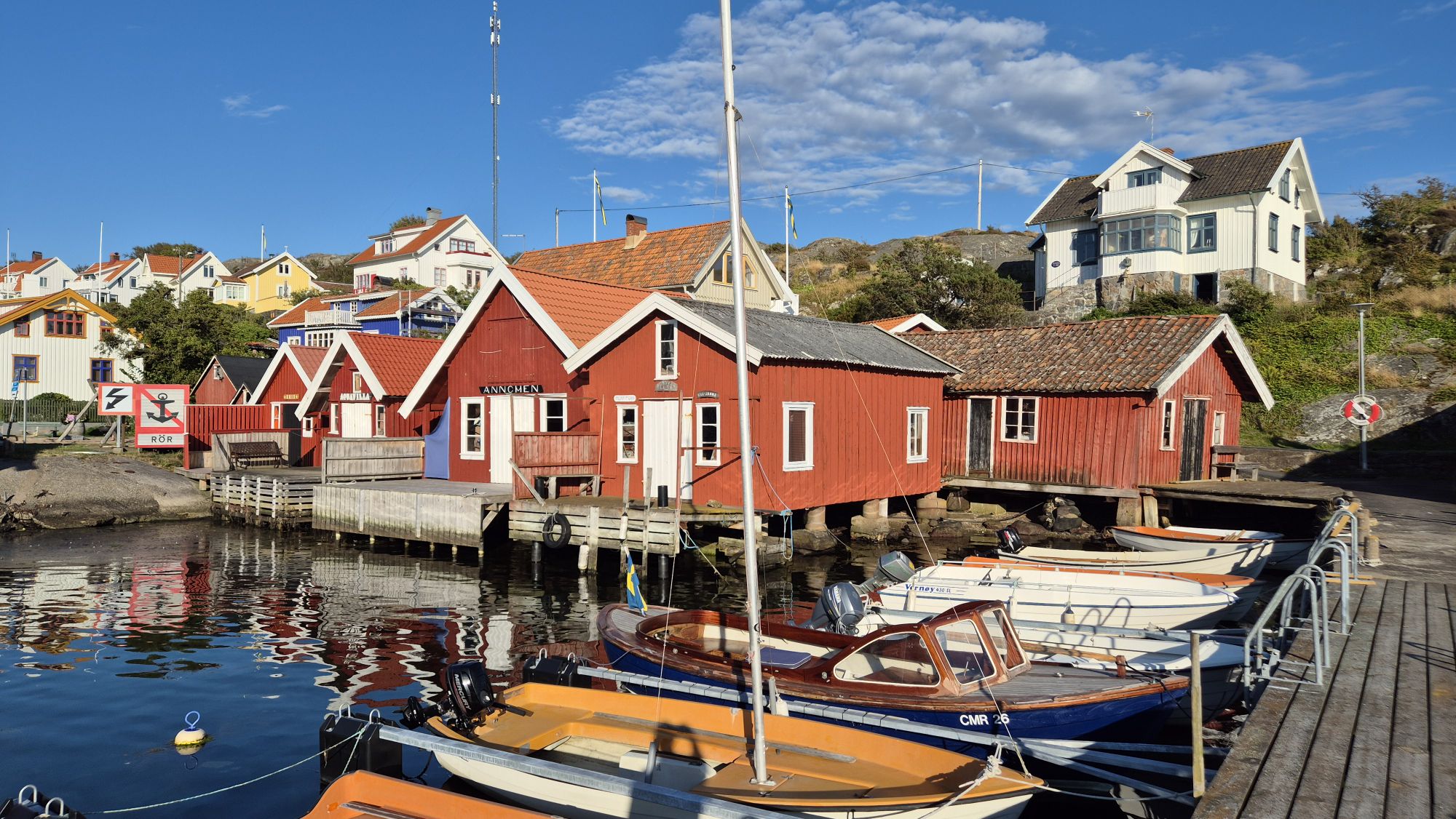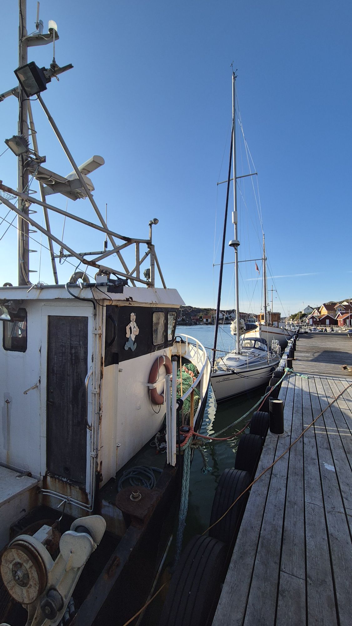 Und weiter ging die Reise am nächsten Tag Richtung Süden. Wir wollten nach Kyrkesund, eine Empfehlung von meinem Bruder, der dort schon ein paarmal zum Angeln war und das auch fast genau auf halbem Weg zwischen Kungshamn und Göteburg, dem Ort für Konstantins Rückflug, lag. Eigentlich wollten wir uns dort nochmal an einem Felsen versuchen, aber eine Pier hatte es uns dann so angetan, dass wir spontan in dem kleinen Nest Kyrkesund neben einem Fischerboot festmachten. Da wir allerdings noch etwas fürs Abendessen einkaufen mussten, in dem Dorf aber kein Købmand-Laden war, macht Konstantin noch eine Dinghi-Tour in einen benachbarten Ort, um die Zutaten für unsere Carbonara zu komplettieren. Ich machte derweil ein paar Fotos in dem wirklich niedlichen Örtchen Kyrkesund, dass eine totale Ruhe und Gelassenheit ausstrahlte.