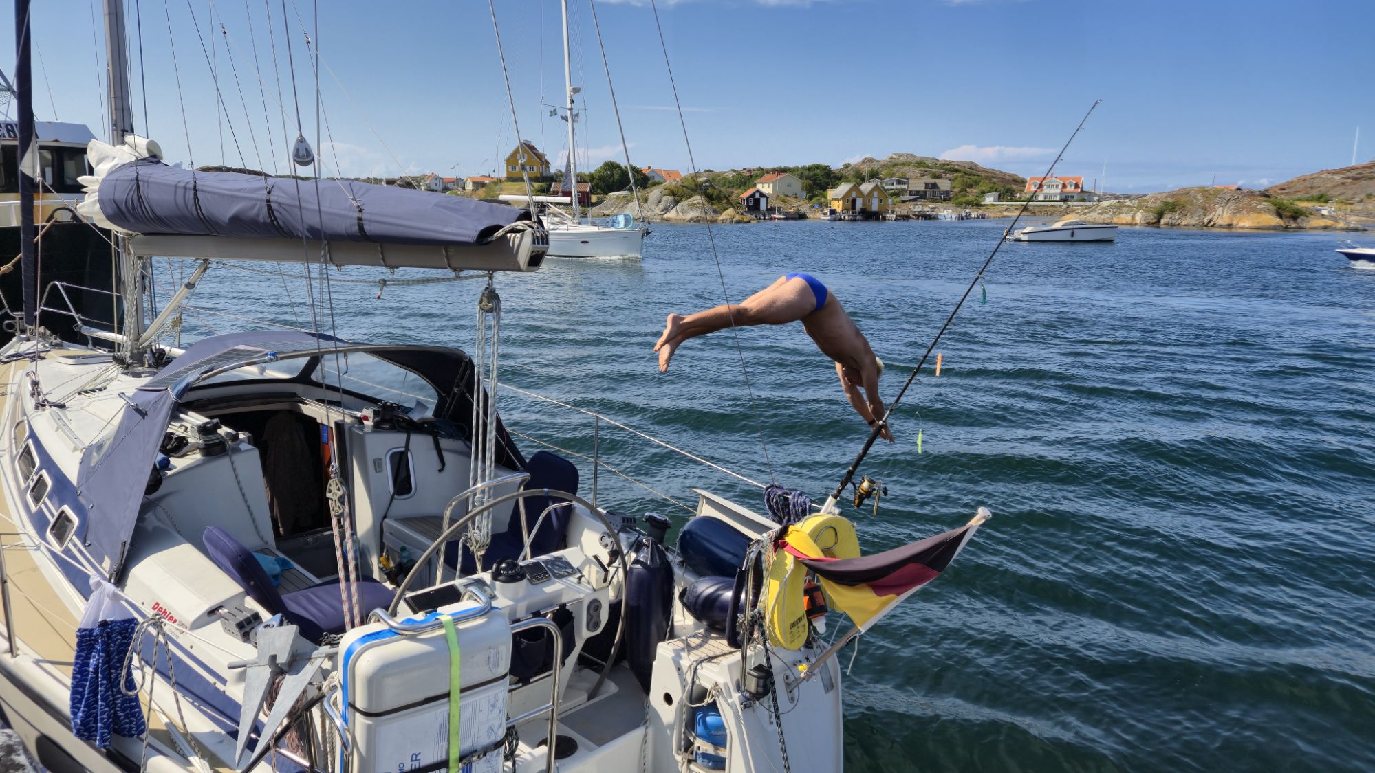 Nach einer ruhigen Nacht stand dann für Konstantin die letzte Etappe nach Göteburg an. Dort wartete am Samstagmittag sein Rückflug in die Heimat. Und wie auch die Tage zuvor, war es ein herrlicher Segeltag mit zumeist Sonnenschein und ausreichendem Segelwind. Erst als wir den Göta-Mündungsbereich kurz vor Göteburg erreichten, drehte der Wind gemeinsam mit kräftigem Regen nochmal richtig auf und wir mussten die Segel Reffen und wurden zum Abschluss des Tages auch nochmal richtig nass. Das tat aber einer in allen Belangen tollen Woche, mit zumeist Mittelmeer-Wetter und ebensolchen Temperaturen, absolut keinen Abbruch. Griechenland hätte nicht schöner sein können. Nur heißer 😉.