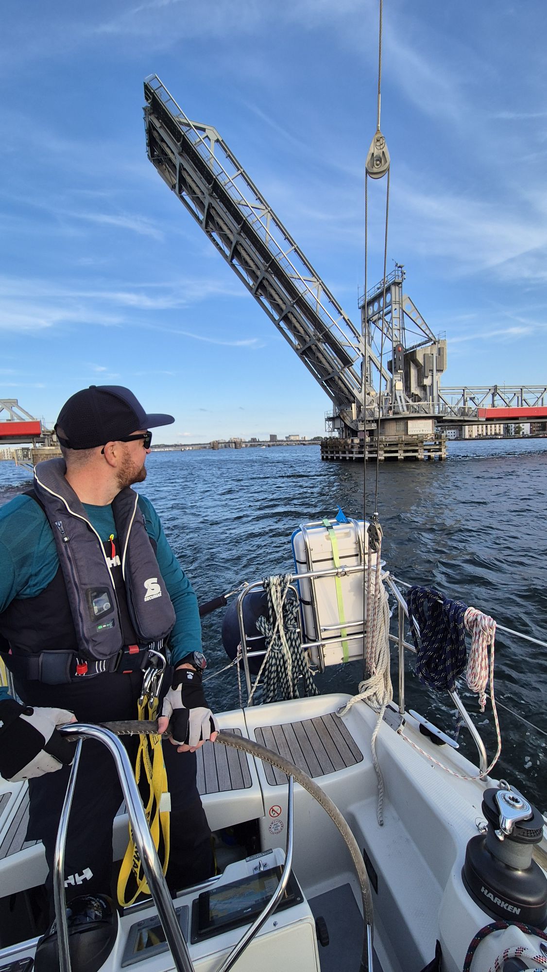Nun stand auch die letzte Etappe für Simon an. Von Hou nach Aalborg in den Limfjord. Bevor es aber in den Fjord gehe sollte, wollten wir noch ein paar Manöver üben, die man bei den praktischen Prüfungen für den Segelschein SKS braucht, der bei Simon in absehbarer Zeit auf der Wunschliste steht. Wende, Halse und Boje über Bord. Die Bedingungen zum Üben waren gut. Bei mäßigem Wind und geringem Wellengang konnten wir die Manöver erfolgreich durchführen. Alle Bojen bzw. Fender, die wir über Bord warfen, konnten (mindestens im 2 Versuch 😉) wieder an Bord geholt werden. Als wir uns dann in der Ansteuerung in den Limfjord befanden, zog noch eine kräftige Schauerzelle mit Donnergroll auf. Die Sicht wurde durch den Sturzregen plötzlich so schlecht, dass ich zunächst wieder raus auf die Ostsee steuerte, um den Schauer dort abzuwarten, um erst bei besserer Sicht in den Limfjord einzulaufen. Aber dann packte uns der Ehrgeiz. Der Wind genau gegen an, aber wir wollten weitersegeln. So kreuzten wir mit ca. 30 Wenden weit in den Limfjord hinein, bis es zeitlich dann doch ein wenig eng wurde und wir für die letzten Meter den Diesel zu Hilfe nahmen. Schließlich mussten noch 2 Brücken passiert werden, bevor wir gegen 20 Uhr im Vestre Bådehavn von Aalborg festmachten. Zu spät zum Kochen, daher schlemmten wir zum Abschluss des Besuches von Simon in einer nahegelegenen Streetfood-Halle mexikanische und griechische Spezialitäten.