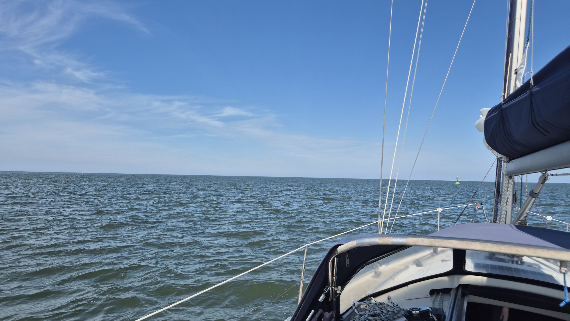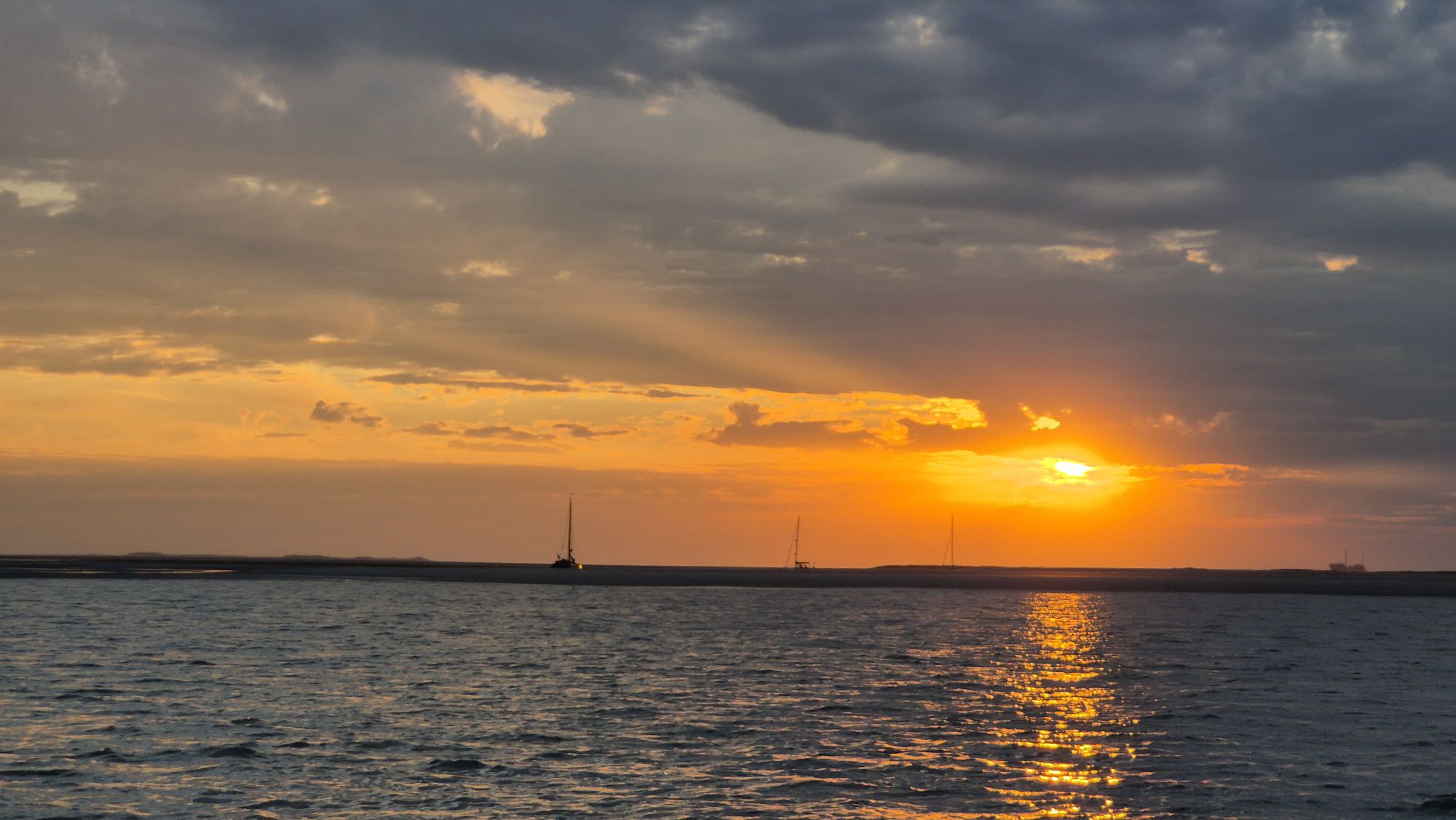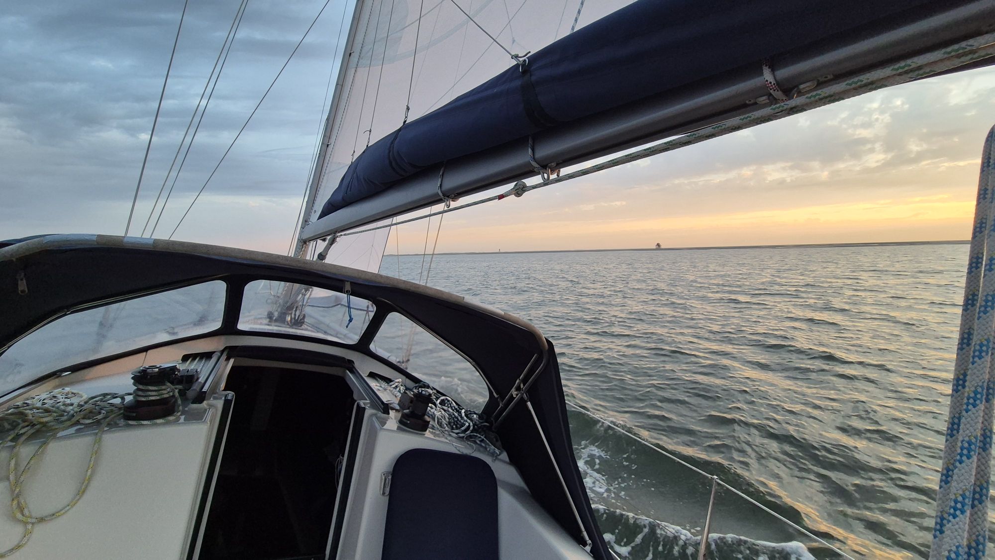Und so kam es dann auch. Am Dienstag ging es dann mit nur noch leichter Temperatur um 12 Uhr mittags auf den ca. 55-Seemeilen-Törn Richtung Lauwersoog, Niederlande. 10 bis 12 Stunden sollte die Reise voraussichtlich dauern und Winde aus SSO in der Stärke 3 bis 4 für mich parat haben sowie Lufttemperaturen von rund 22 bis 25 Grad. Also perfekte Bedingungen insbesondere in meiner angeschlagenen Situation. Und es wurde auch ein wirklich schöner Törn. Bei der Ausfahrt von Norderney hatte mich Franzi noch von der Milchbar aus entdeckt und eine Abschiedsfoto geschossen, wie ich (wg. starker Gegenströmung noch unter Motor) bei idealen Bedingungen ca. 2 Stunden vor Hochwasser aus dem Seegatt Schluchter auf die Nordsee raus bin. Kurz darauf gingen dann auch die Segel hoch und die blieben es auch bis zum Westgatt, welches zwischen Ameland und Schiermonnikoog nach Lauwersoog führt. Das Westgatt erreichte ich pünktlich zum Einsetzen der Flut und so konnte ich dann die letzten 10 Meilen bis zum Hafen den Schiebestrom nutzen und in die Abenddämmerung hineinsegeln.