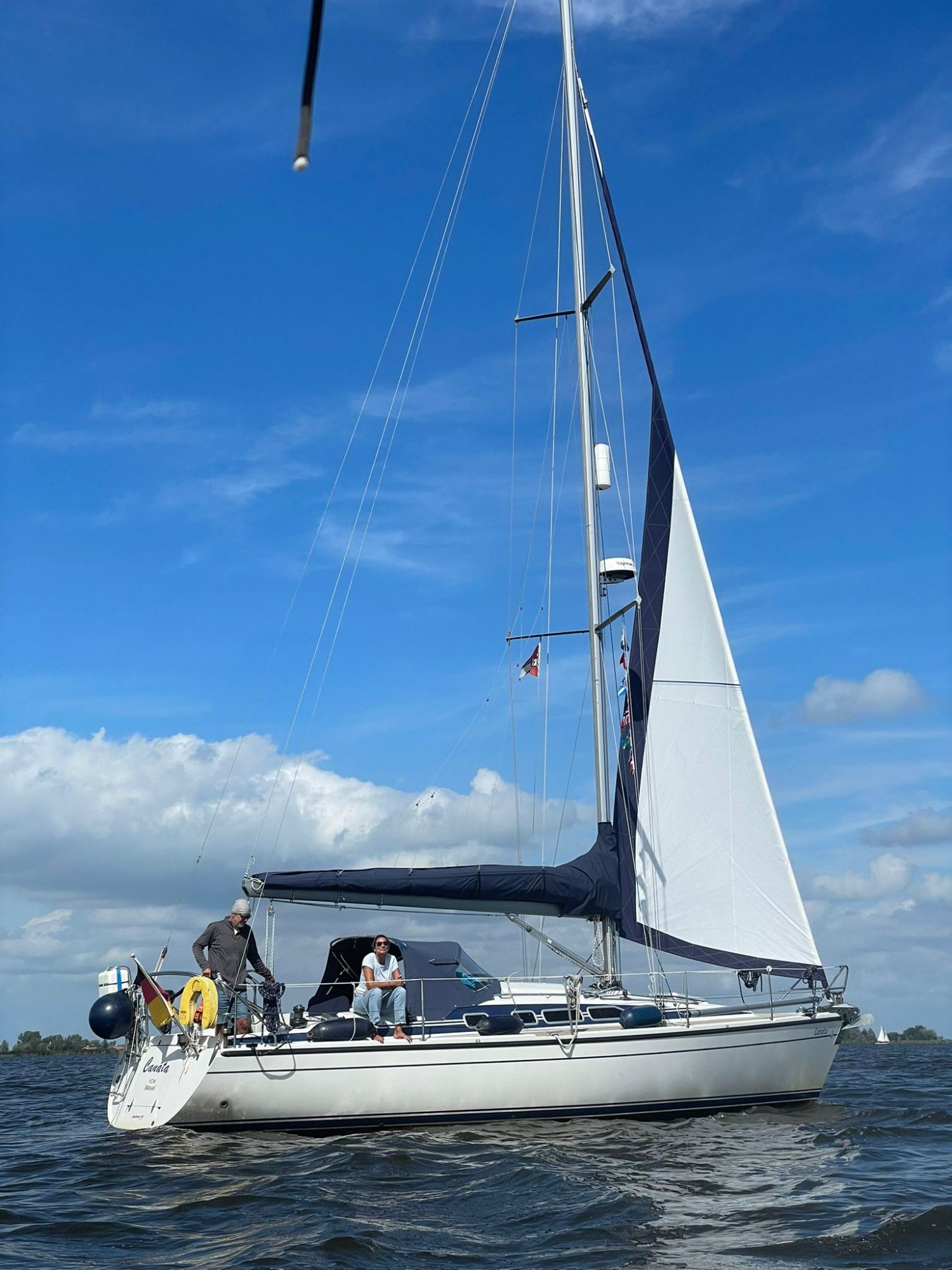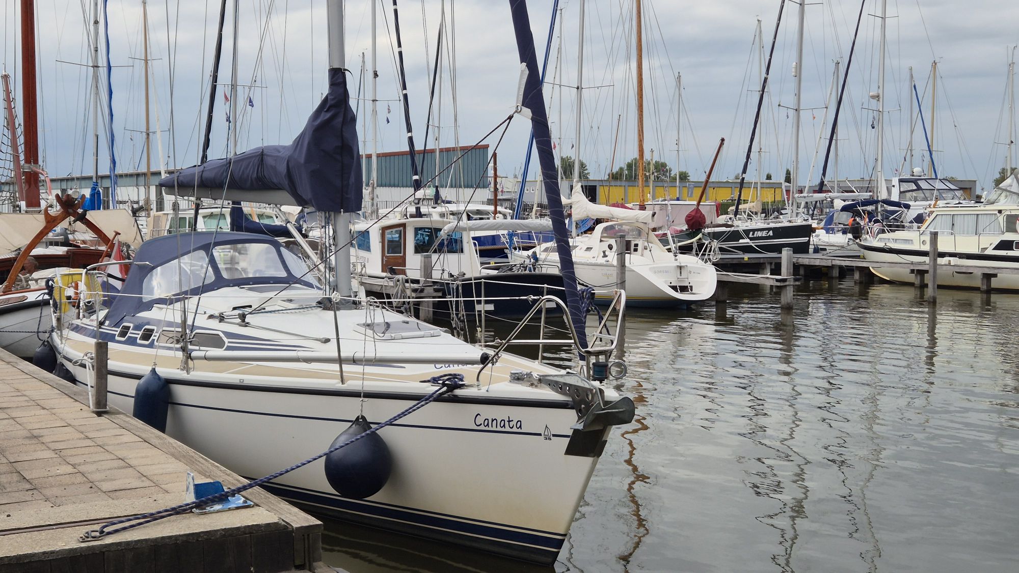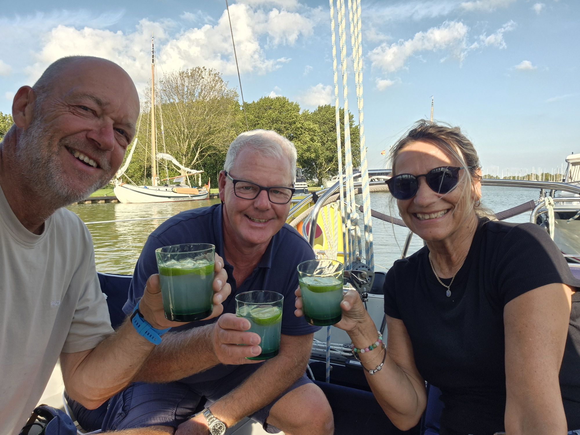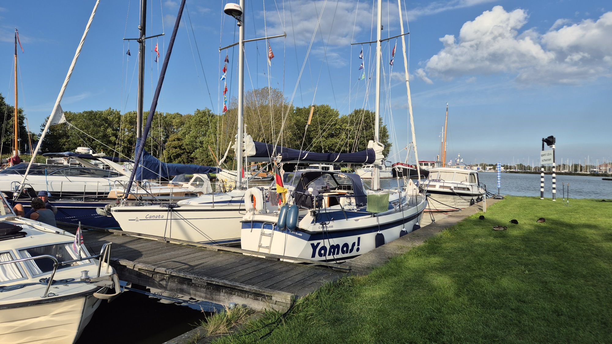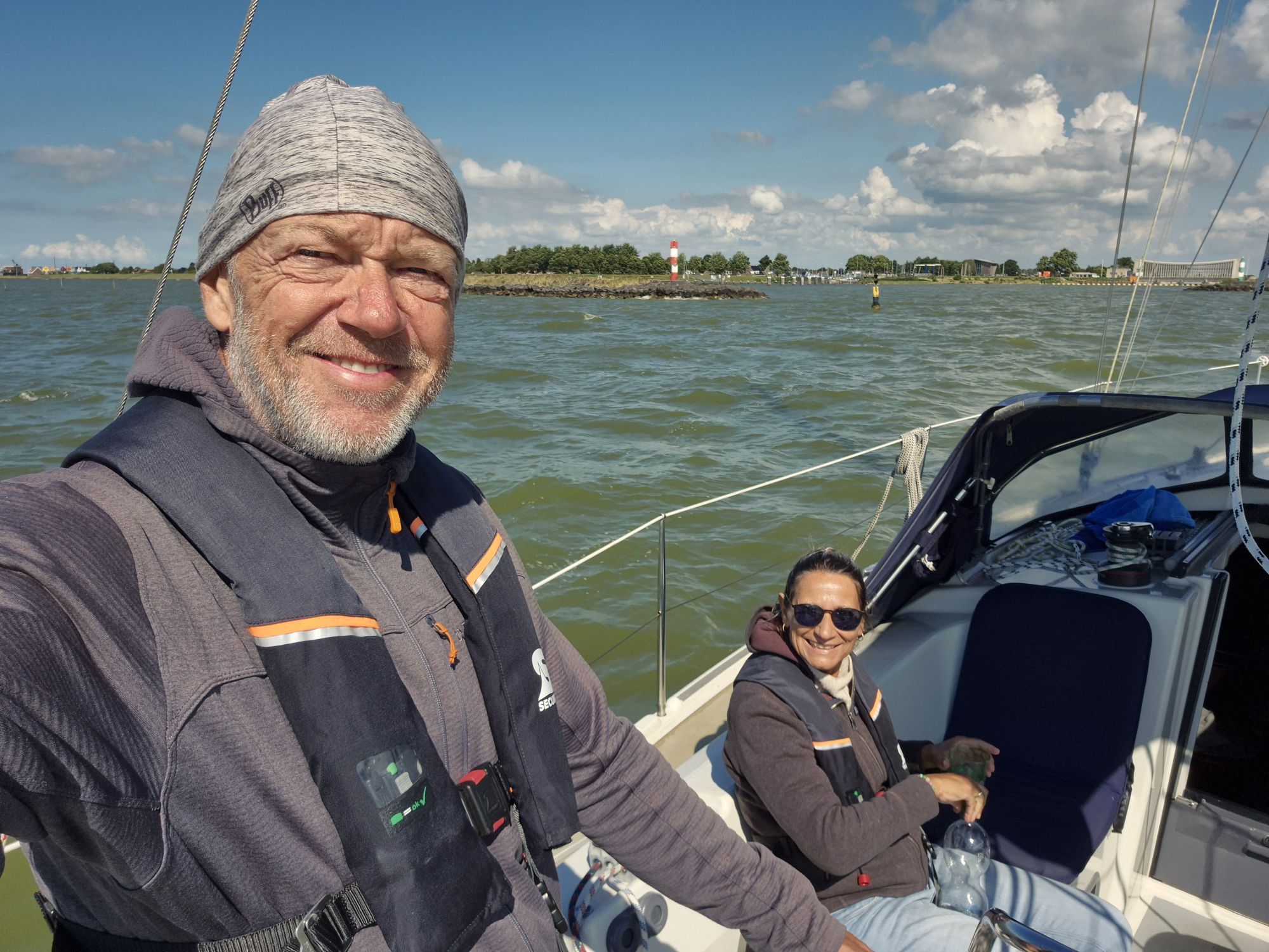 Angekommen in Leeuwarden habe ich dann erstmal ein kleines Nickerchen gemacht, um ein wenig Schlaf der letzten Nacht nachzuholen. Aus Einkaufen, Kochen, Essen, Schlafen bestand dann mein Restprogramm des Tages. Die Nacht in Leeuwarden war dann sehr ruhig und ich konnte mich und die Reste meines Infektes durch einen langen Schlaf weiter auskurieren. Gleich zur Brückenöffnung um 9:00 Uhr ging es auch weiter in Richtung Harlingen. Dort wollte ich nochmal ins Watt, um dann in Kornwerderzand ins Ijsselmeer zu schleusen und in Makkum auf Annettes Ankunft am Freitagmittag zu warten. In der Zeit bis dahin fing ich dann schon mal an, meine Sachen im Schiff zu sortieren. Was bleibt an Bord, was kommt mit nach Hause etc. Nach drei Monaten hatte ich es mir natürlich an Bord eingerichtet. Auch das Deck konnte mal eine Wäsche vertragen. So verging die Zeit schnell und am Freitag gegen 12:30 kam Annette dann in Makkum an. Das Auto hatte sie in unserem Zielhafen in Woudsend geparkt und wurde von unserem Segelfreund Uli (vielen lieben Dank! Und wenn ihr mal eine Pinne braucht: https://pinnenparadies.org/) mit dem Auto nach Makkum gebracht. So verbachten wir noch ein schönes gemeinsames Wochenende in Friesland bevor ich meine Reise mit dem Kreuzen meines Kielwassers vom 29.6. nach 90 Tagen „offiziell“ beendet hatte (ein kleines Resümee folgt noch). Und kurz vor meinem Winterhafen kam uns auf dem Heeger Meer noch Konstantin als Empfangskomitee mit einer Jolle entgegengesegelt :-). Er machte dort mit Freunden ein Segelwochenende.